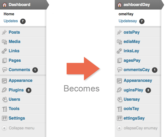 Here you can see that all of the link text in the admin menu has been converted to pig latin. This is because WordPress core has prepared them for translation. If we are testing a theme with the Pig Latin plugin we might come across something like the following: