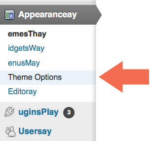 Here, our theme has created a custom Theme Options screen but the Pig Latin plugin did not convert the text in the admin menu. This is because our theme has not prepared this string for translation. Basically if strings are not converted to pig latin it’s an indication that you should prepare the string to be translated.