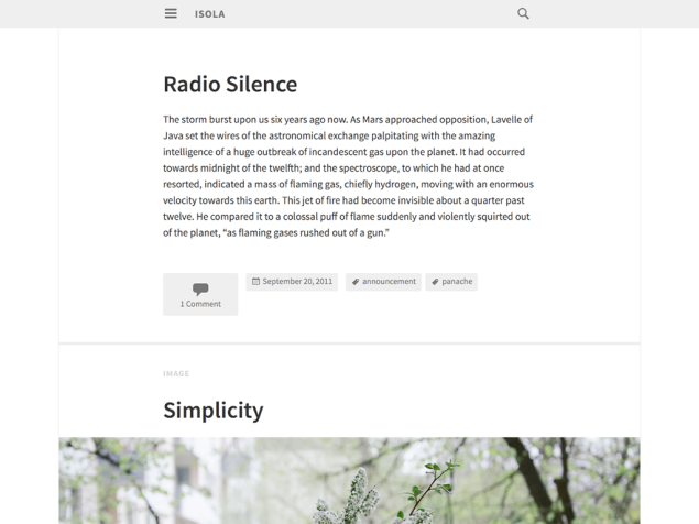 Isola was inspired by a “less is more” philosophy and influenced by mobile design patterns. This minimalist theme was designed by Joen Asmussen, with web development by Caroline Moore.