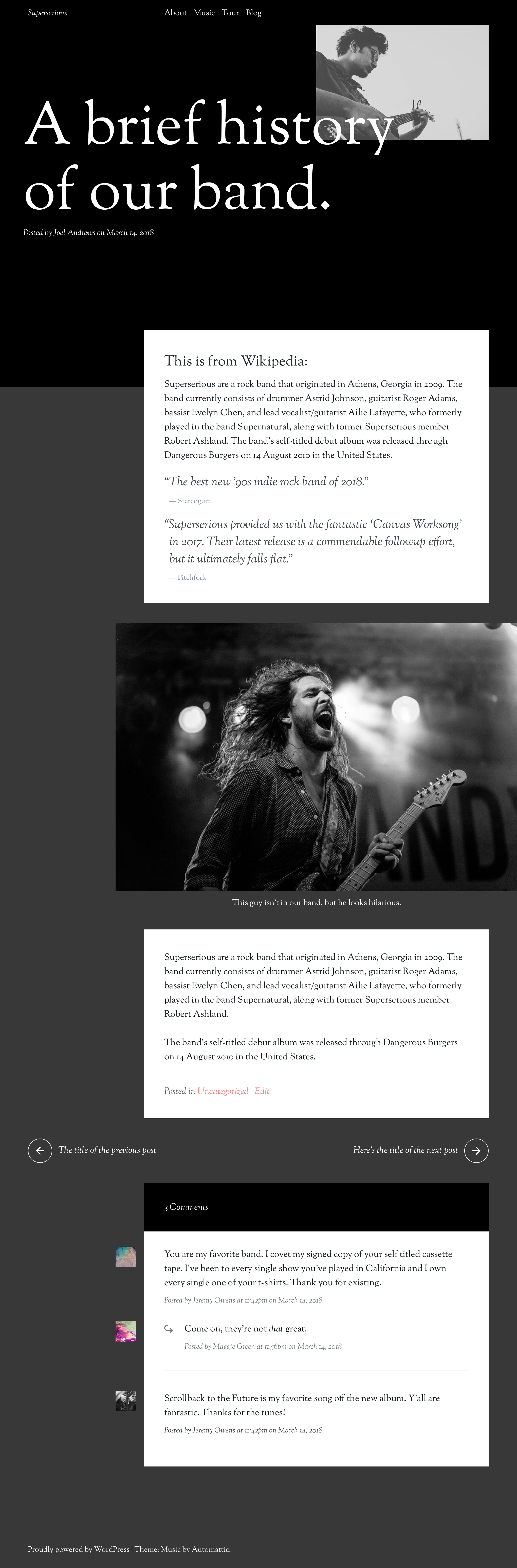 In a nutshell, we’re a bunch of people who really care about WordPress themes and want to see them get better and better — on WordPress.com and every self-hosted WordPress site. This is our blog. We are Ian Stewart, Lance Willett, and Matías Ventura. First formed in early 2010 at Automattic, we develop themes for the millions of users on the popular blogging service WordPress.com. While improving themes from the community as well as crafting our own we work hard to ensure our improvements make it back to the open source community. Our Goals Every WordPress.com user should feel like there’s a theme that fits them perfectly, that is exactly how they want to present themselves to the world, that they’re excited to show to their friends. We want everyone to feel a sense of momentum and ever-increasing possibilities, and to do so we will present as many perfect-fit WordPress themes to as many WordPress.com users as we can. We will ensure all of our public work represents the best in coding practices, web standards, and technical excellence. We will craft all of our themes to have consistent user experience and meet our users expectations and hopes. We will teach…