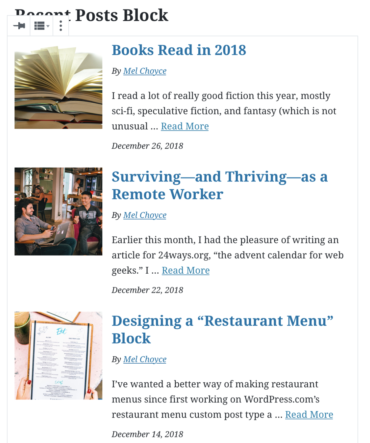 There are similar overlaps with other blocks. For example the layout of the WordPress.org gallery block could also be used to display a list of posts, as could the recently launched Tiled Gallery block. Evidently there are many layout possibilities for a list of posts!