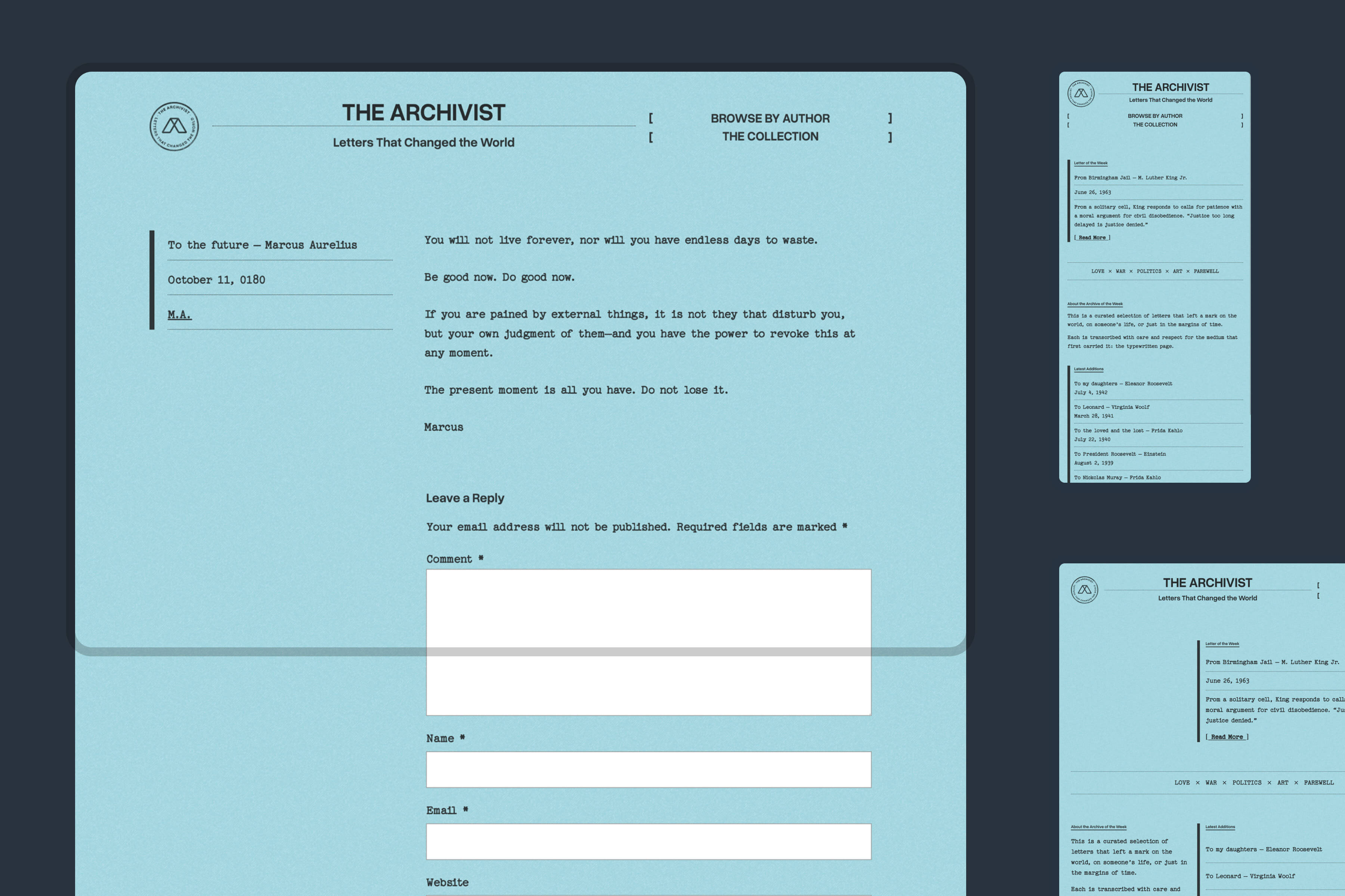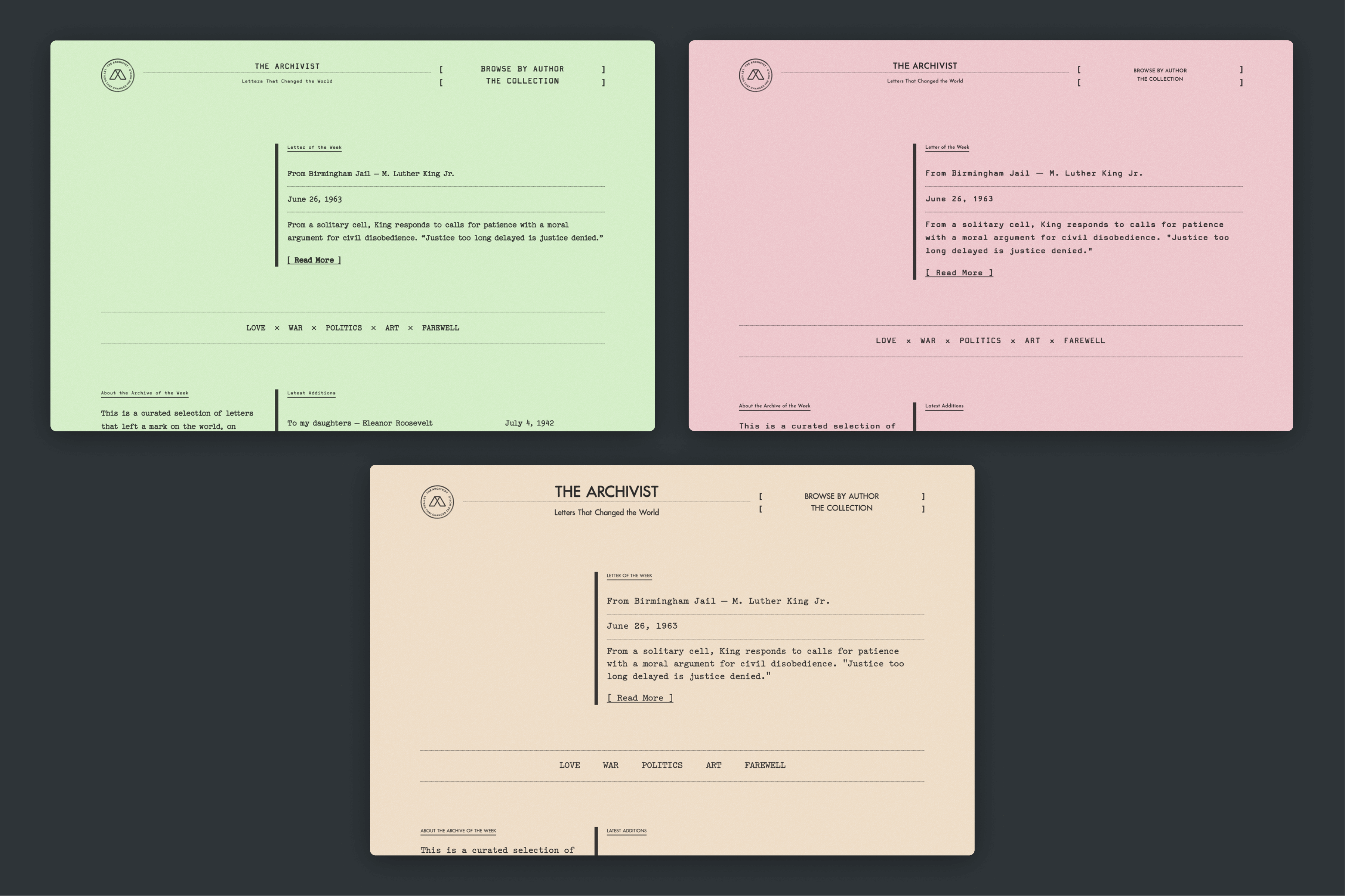 The Archivist employs a monospaced typeface throughout, which reinforces the typewriter manuscript’s feel. It employs restraint, with its variations relying on caps (small, all caps) and title case for hierarchy, rather than size or weight.