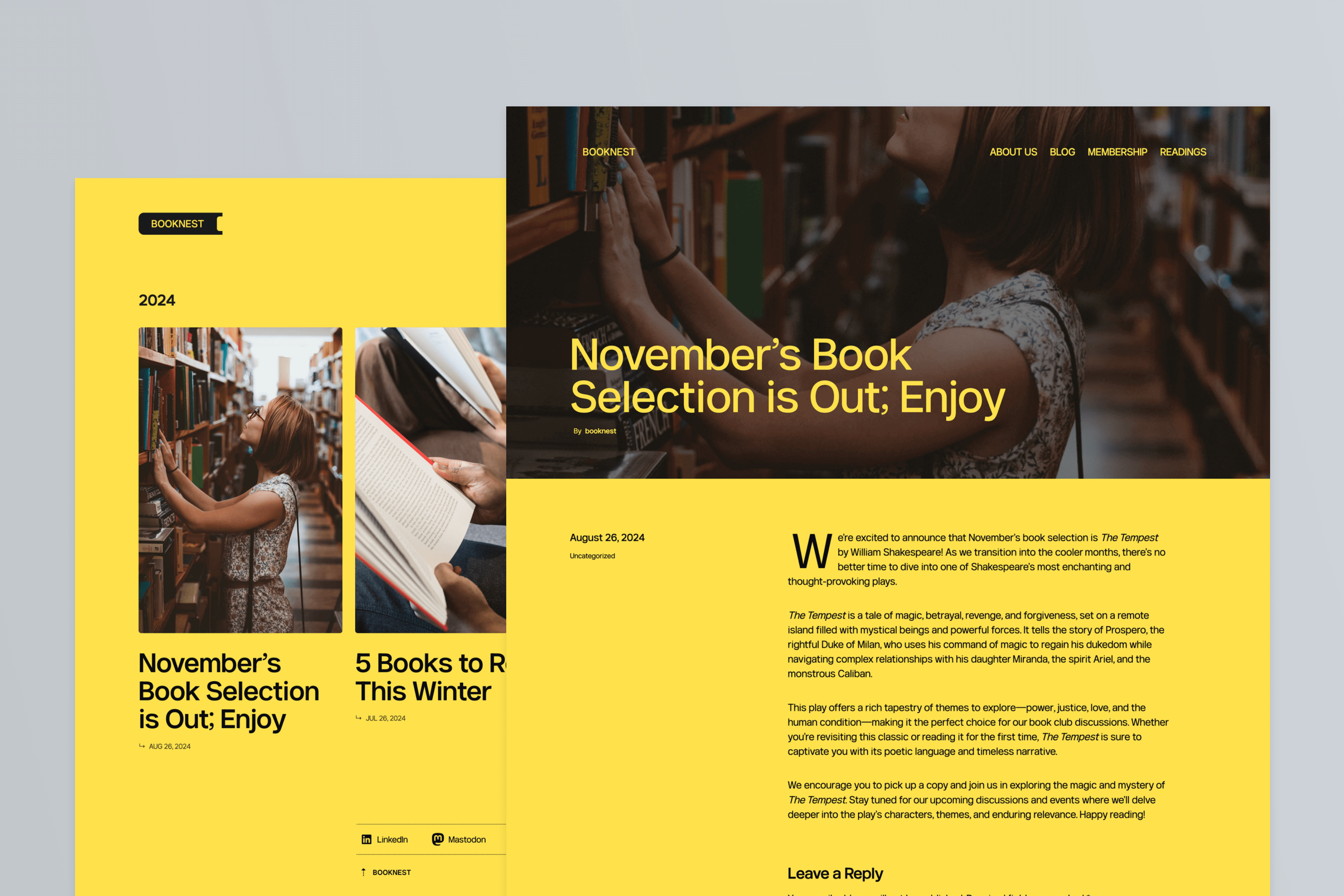 Booknest is a clean, user-friendly theme designed for book clubs and readers. Easily organize events, share reviews, and build a vibrant community of literature lovers.