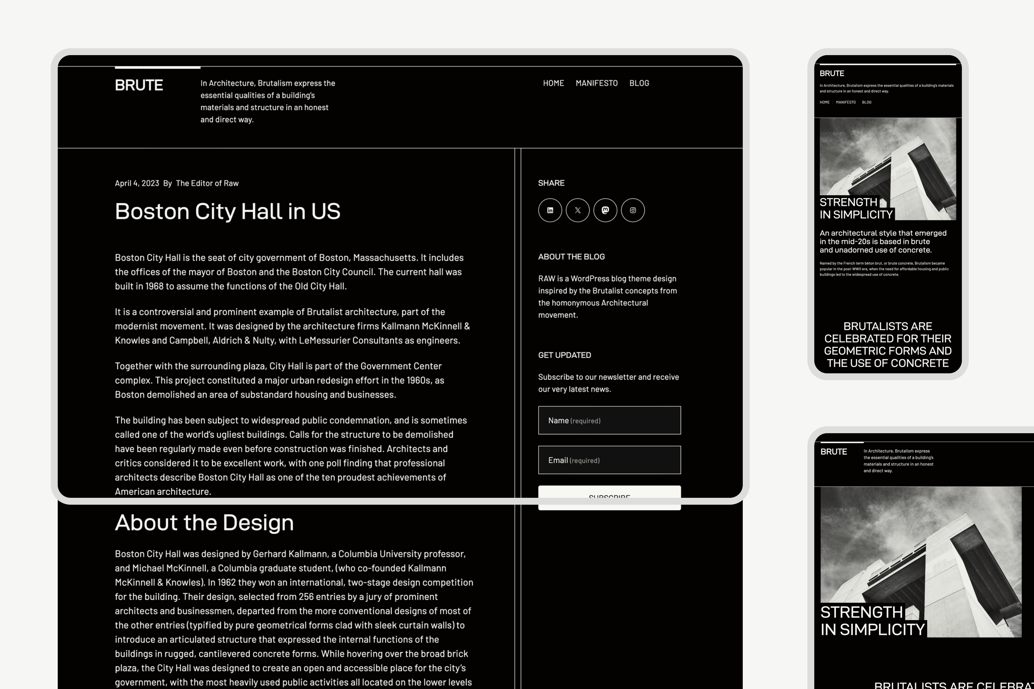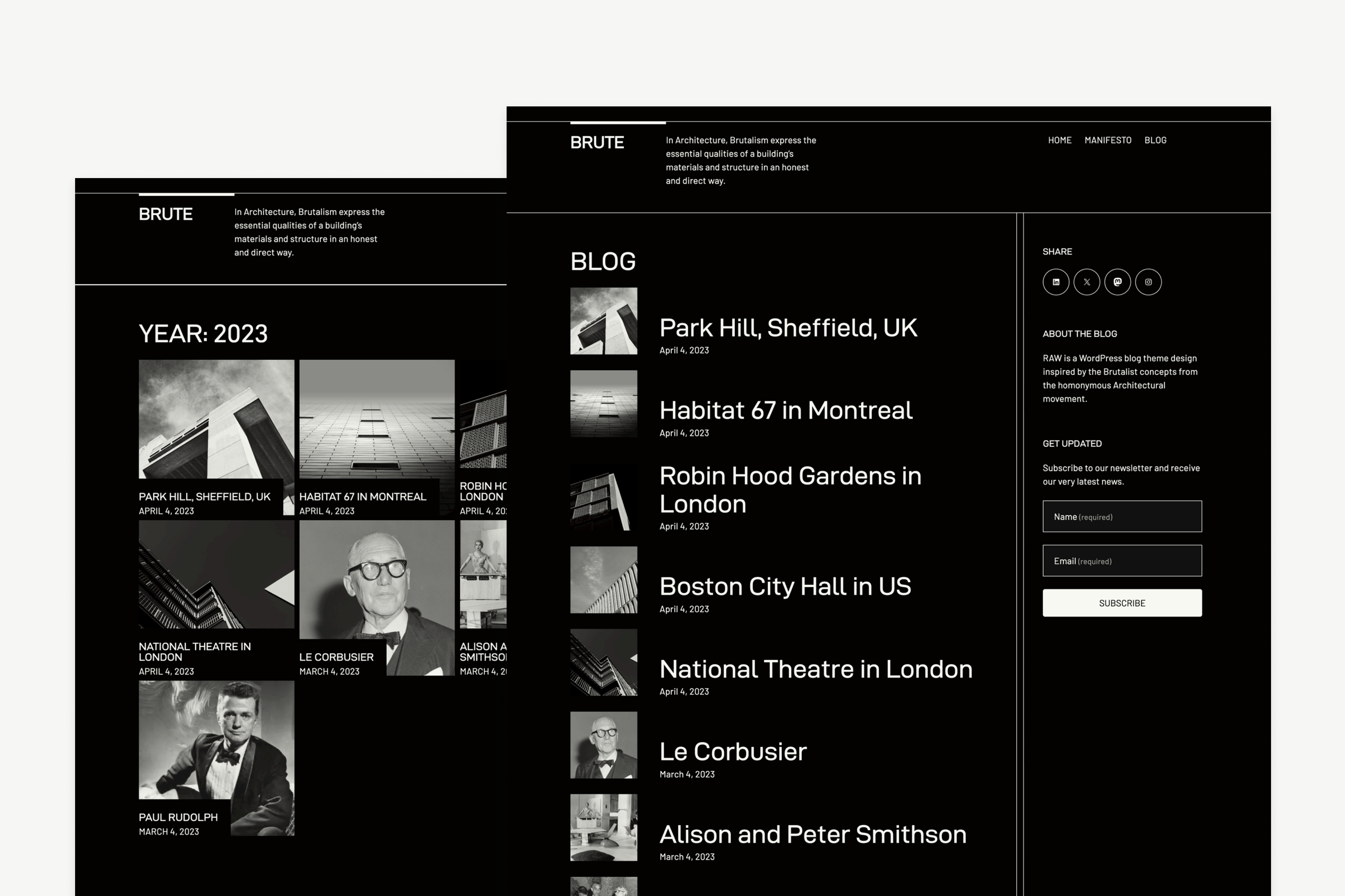 Brute is a theme design inspired by the Brutalist concepts of the homonymous Architectural movement. It aims to be harsh, honest, utilitarian, and useful. It is a good portfolio pick for architects, design studios, and creative organizations.