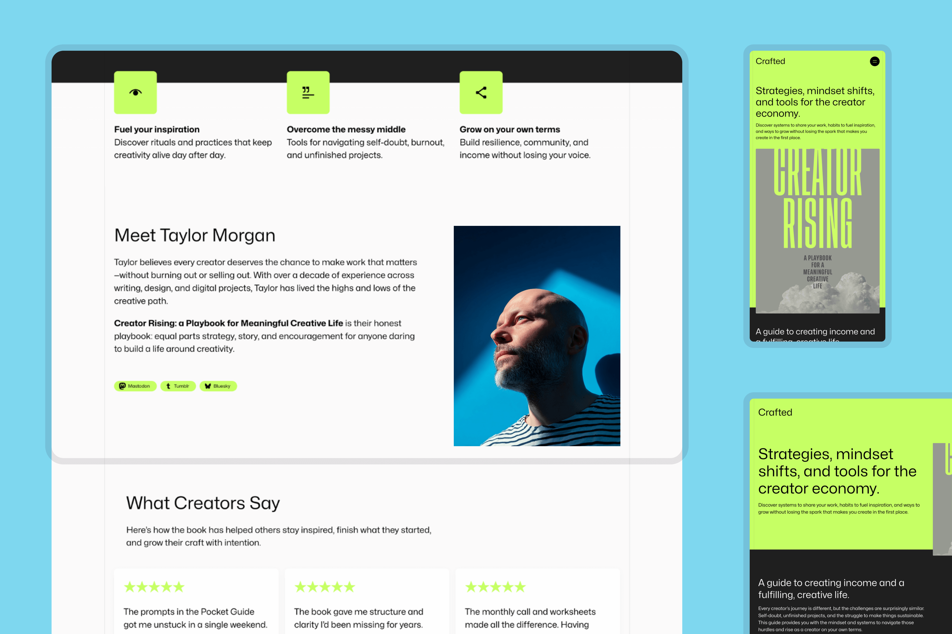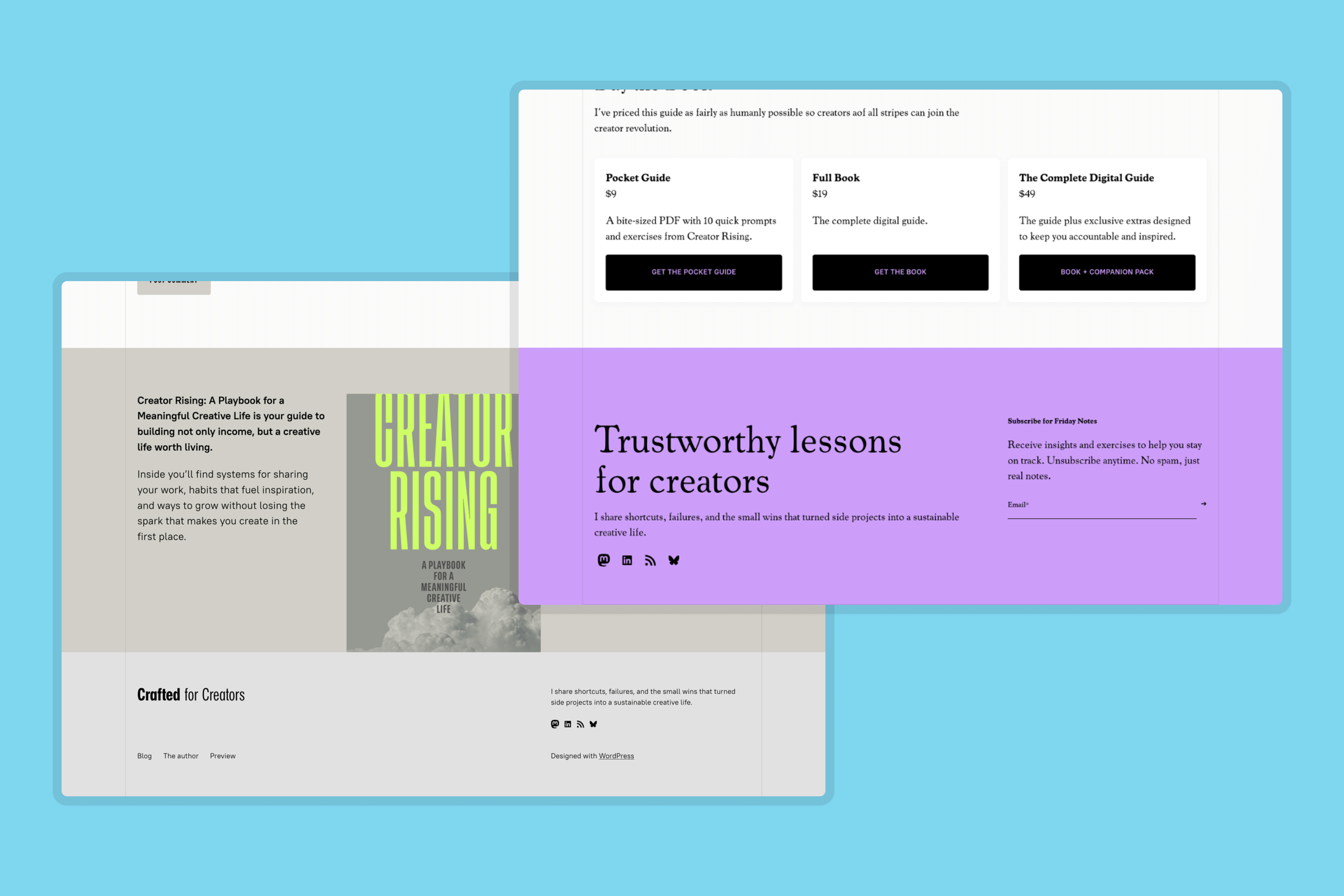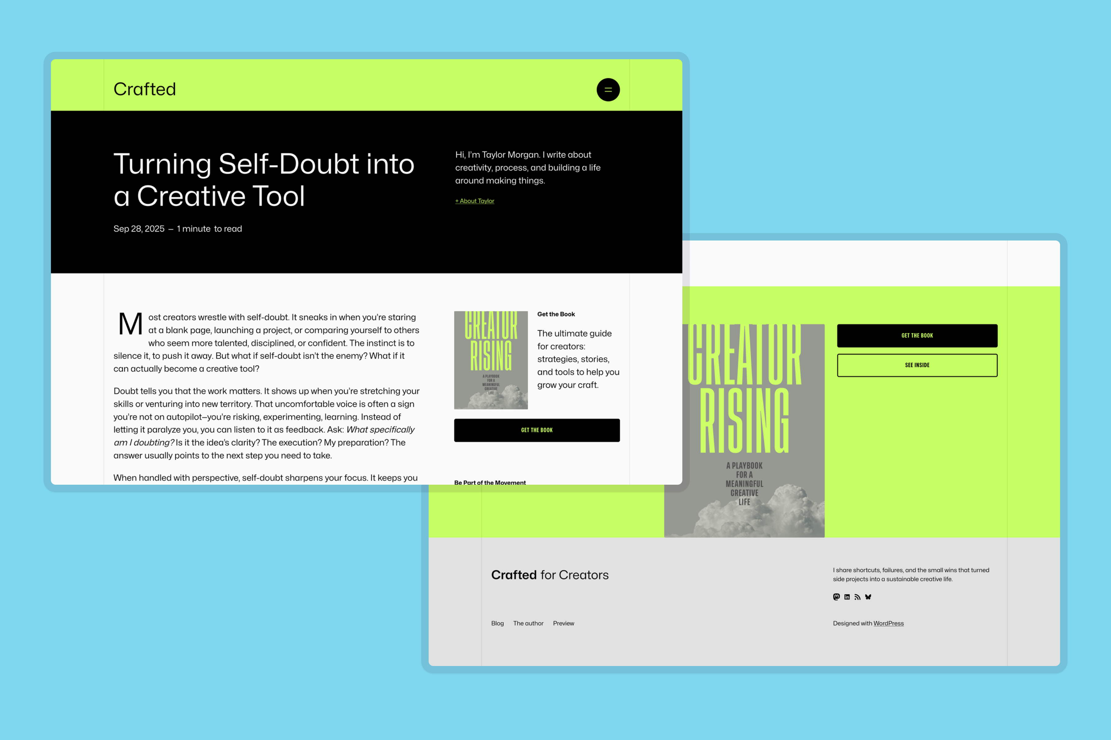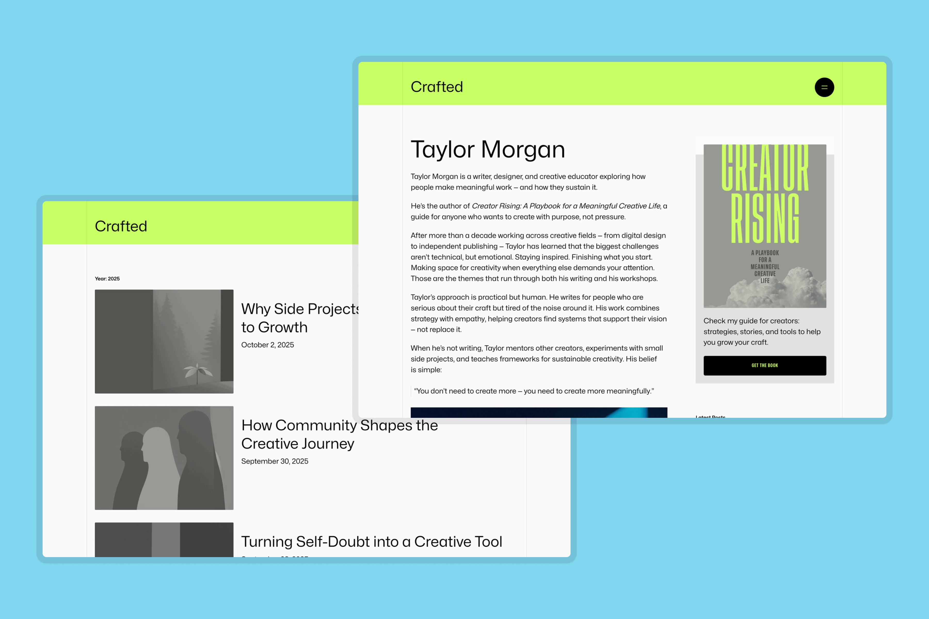 Crafted is a creator-focused WordPress theme designed for writers, educators, and independent professionals who intentionally share their work and process. With its minimal editorial layout and flexible structure, it provides a refined space for essays, courses, guides, and reflections. Perfect for creators who build trust through clarity, it combines simple design and practical tools to help creators communicate with authenticity and care.