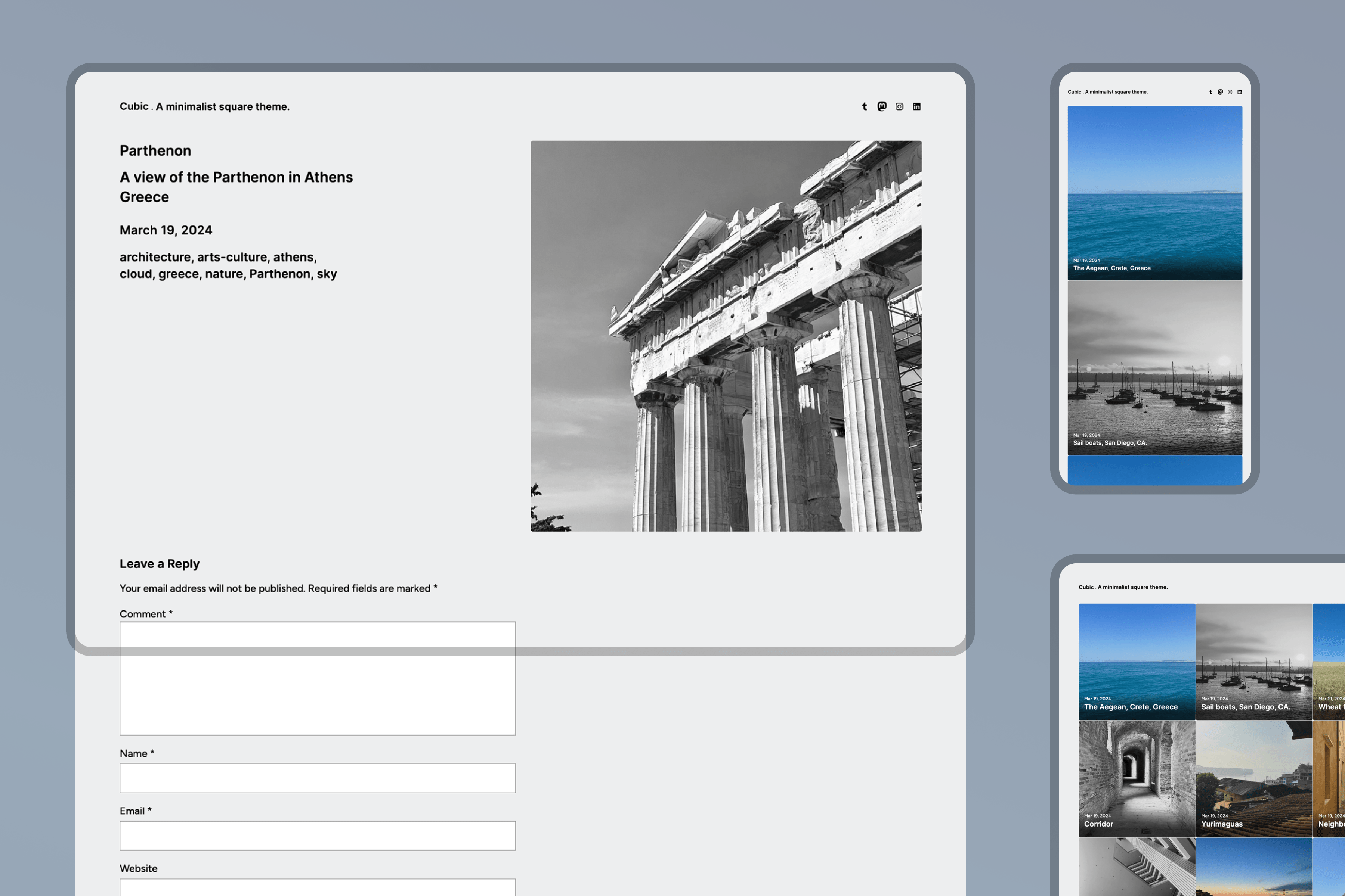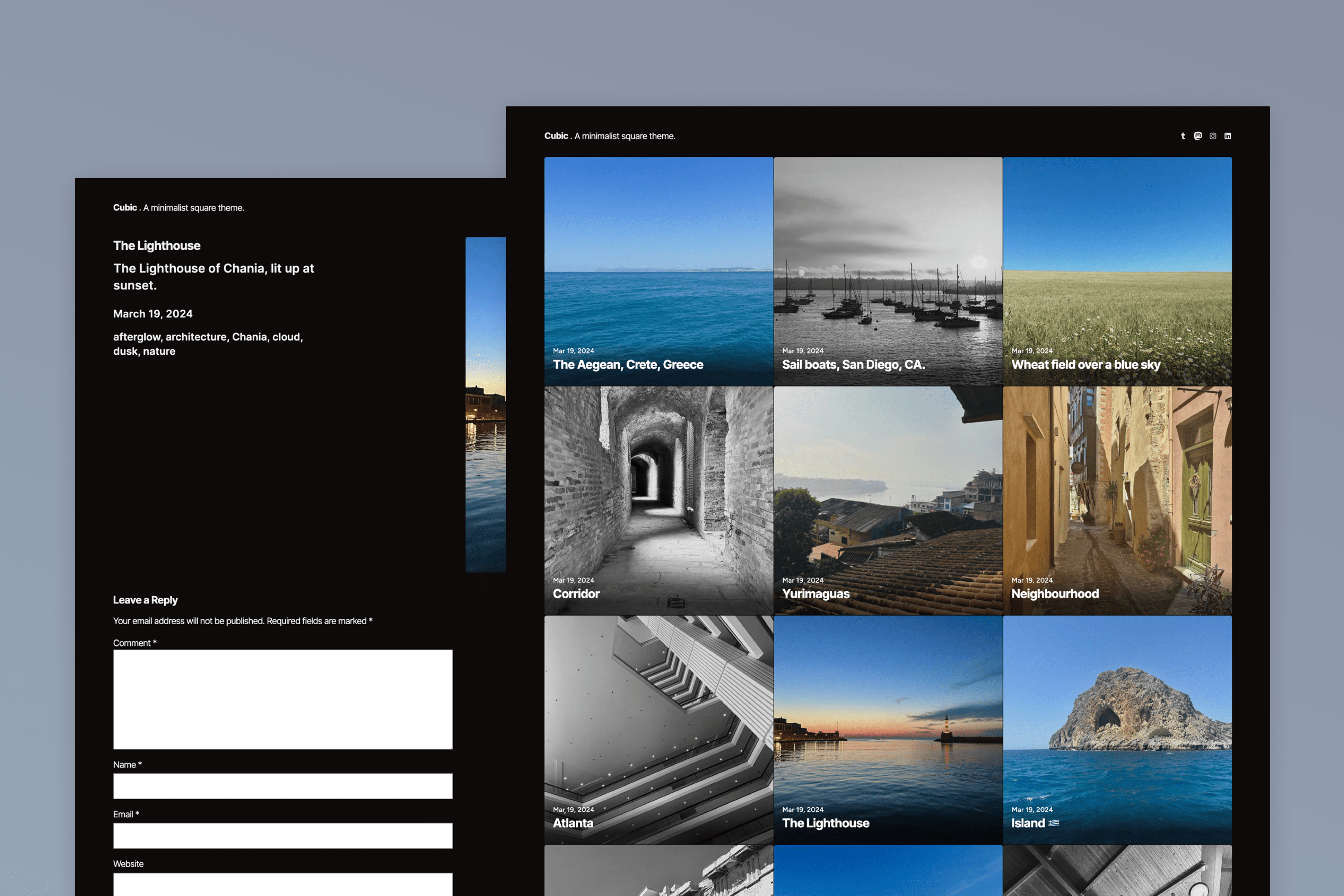 Cubico is a block version of the classic Cubic, a grid-based theme with large featured images, perfect for photoblogging.