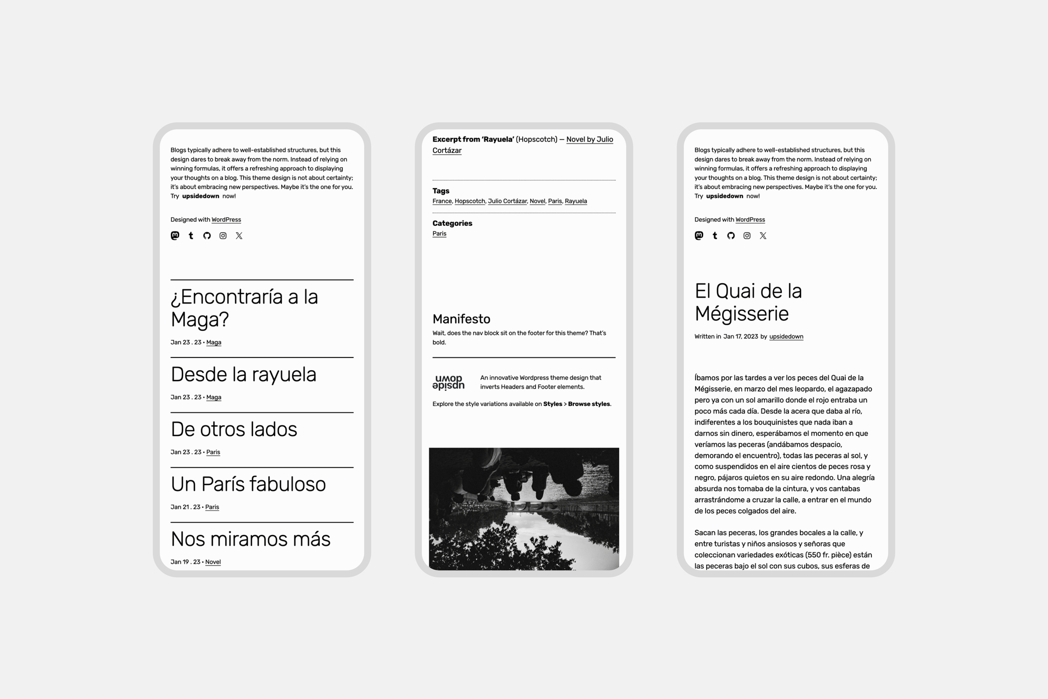 A blog theme entirely designed in the Editor, Inversum offers a direct experience of post-reading with its noticeable post titles listed on a text-only page and an original swap of header and footer blocks.