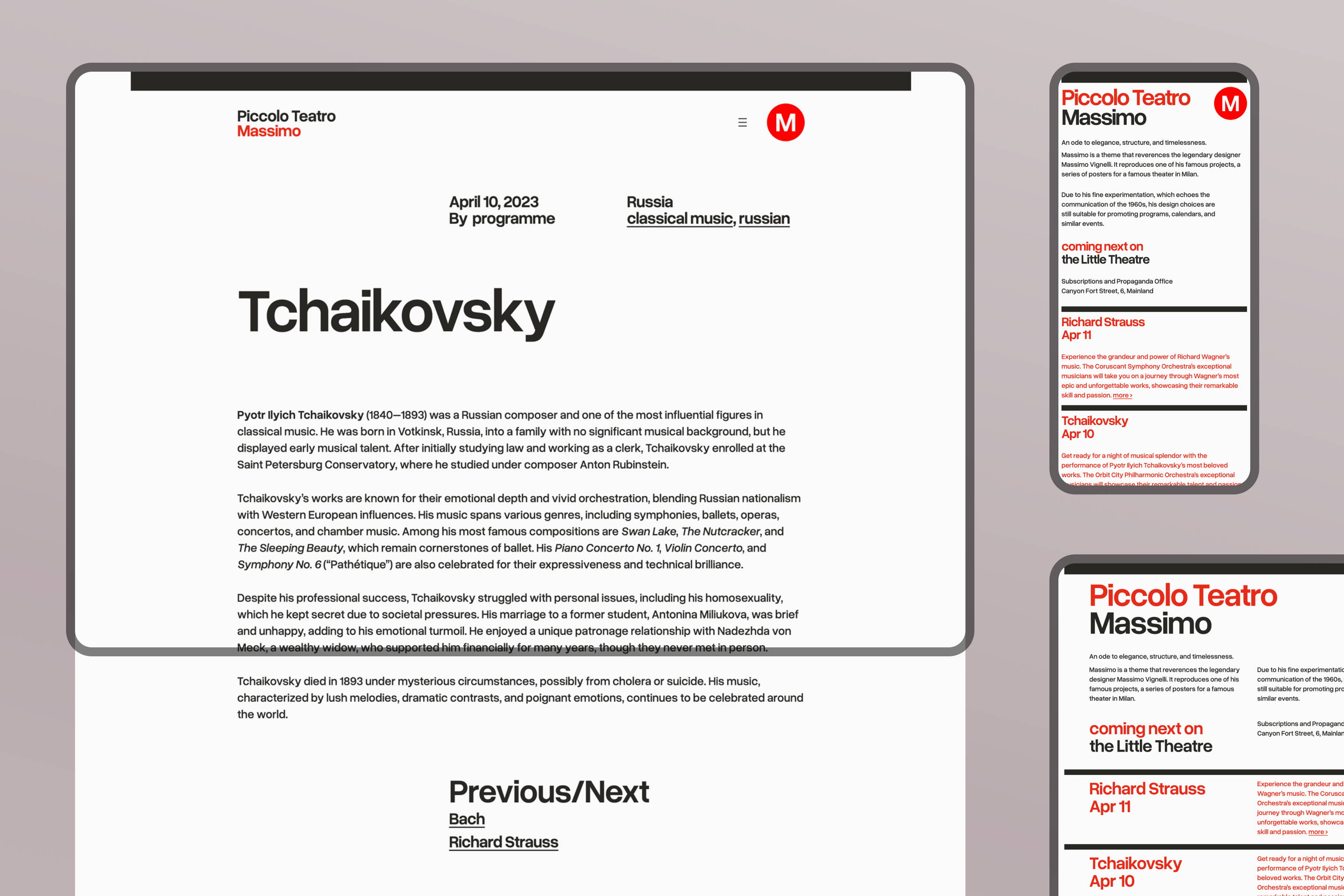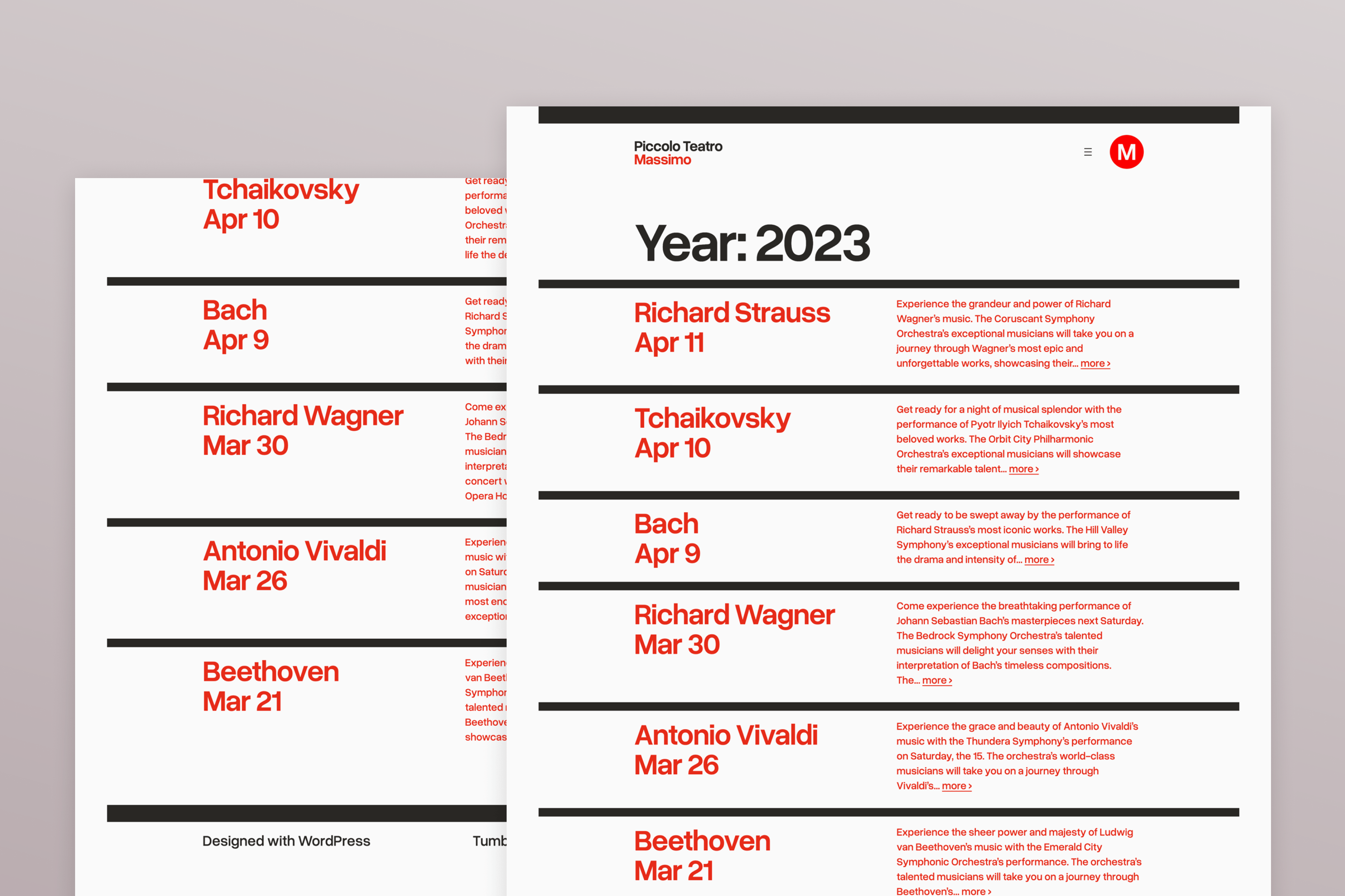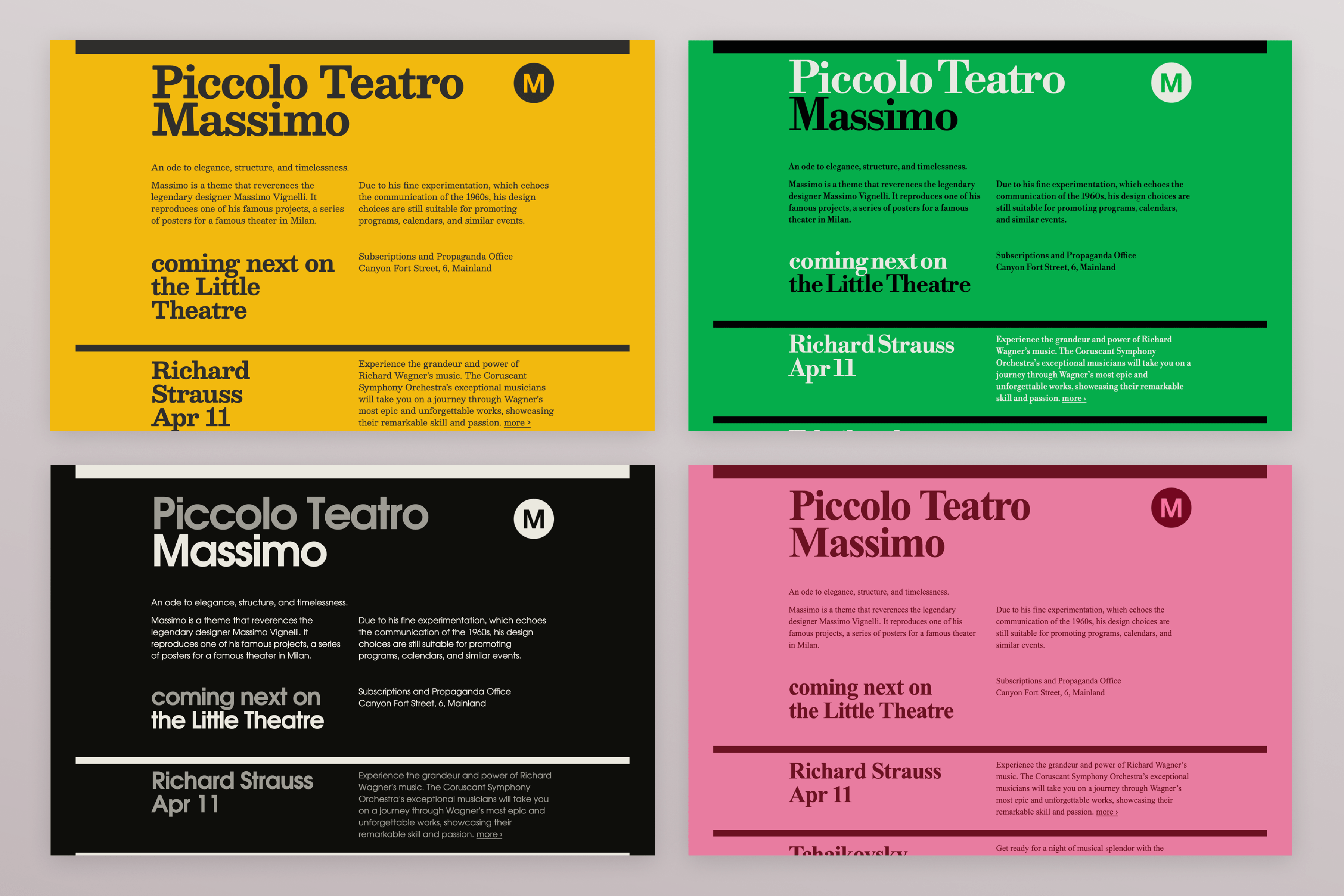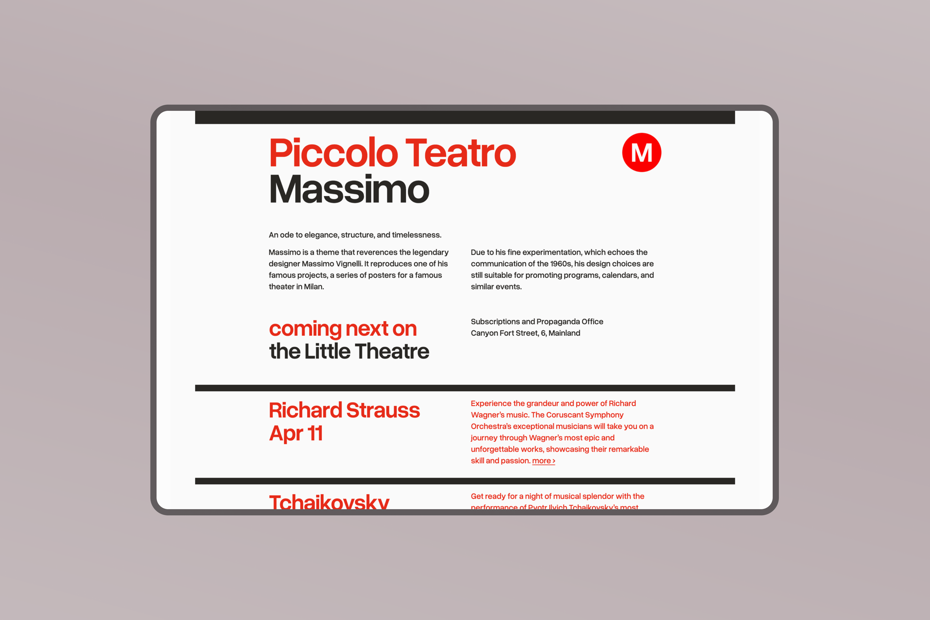 Massimo is a blog theme that reverences the legendary designer Massimo Vignelli and his playbills for the Piccolo Teatro in Milan. This design is suitable for programs, calendars, and announcements.