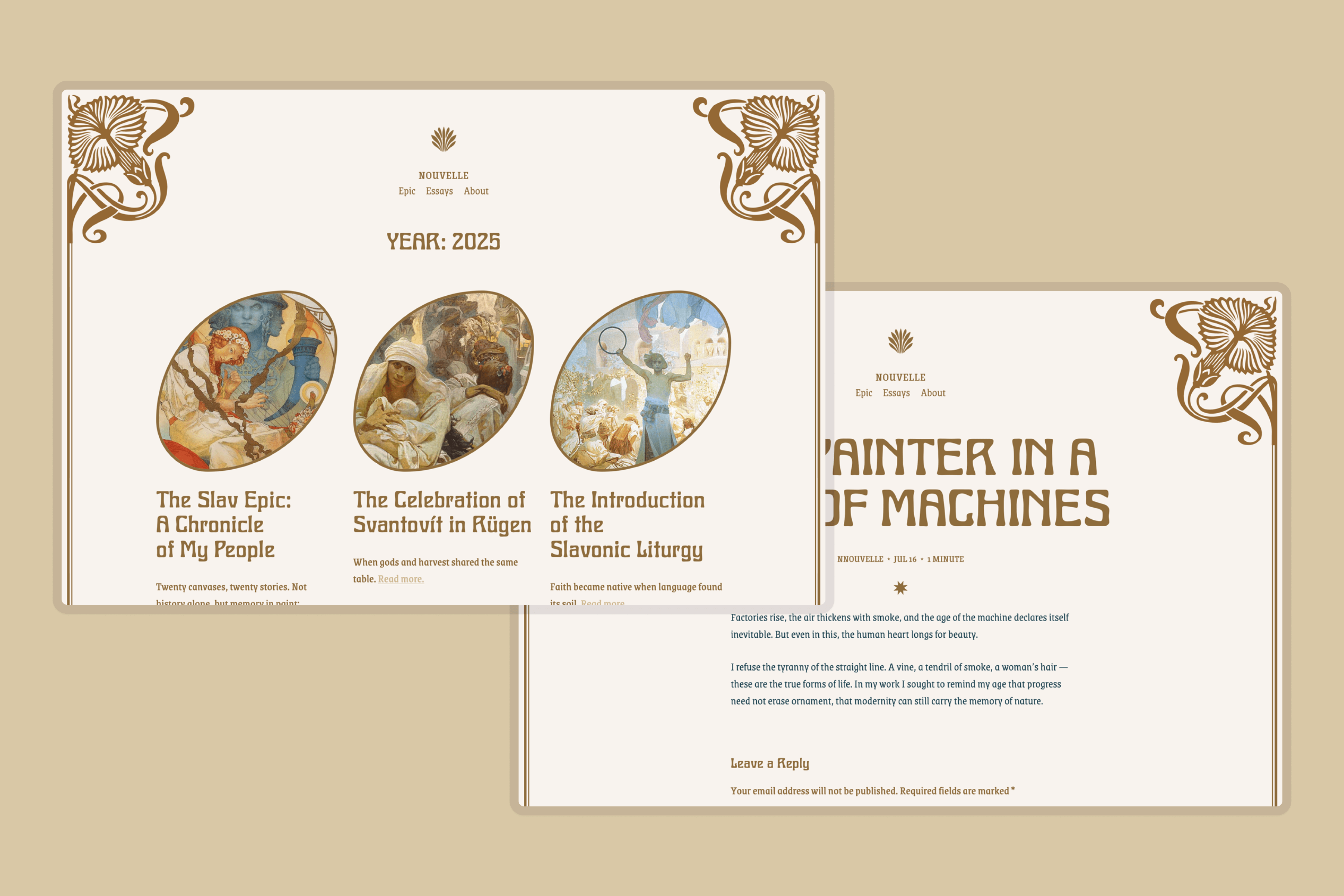 The theme balances decorative detail with simplicity. Subtle flourishes, curved dividers and frames, and ample white space maintain a connection to the Art Nouveau style while keeping the theme versatile and user-friendly for any type of cultural blog.