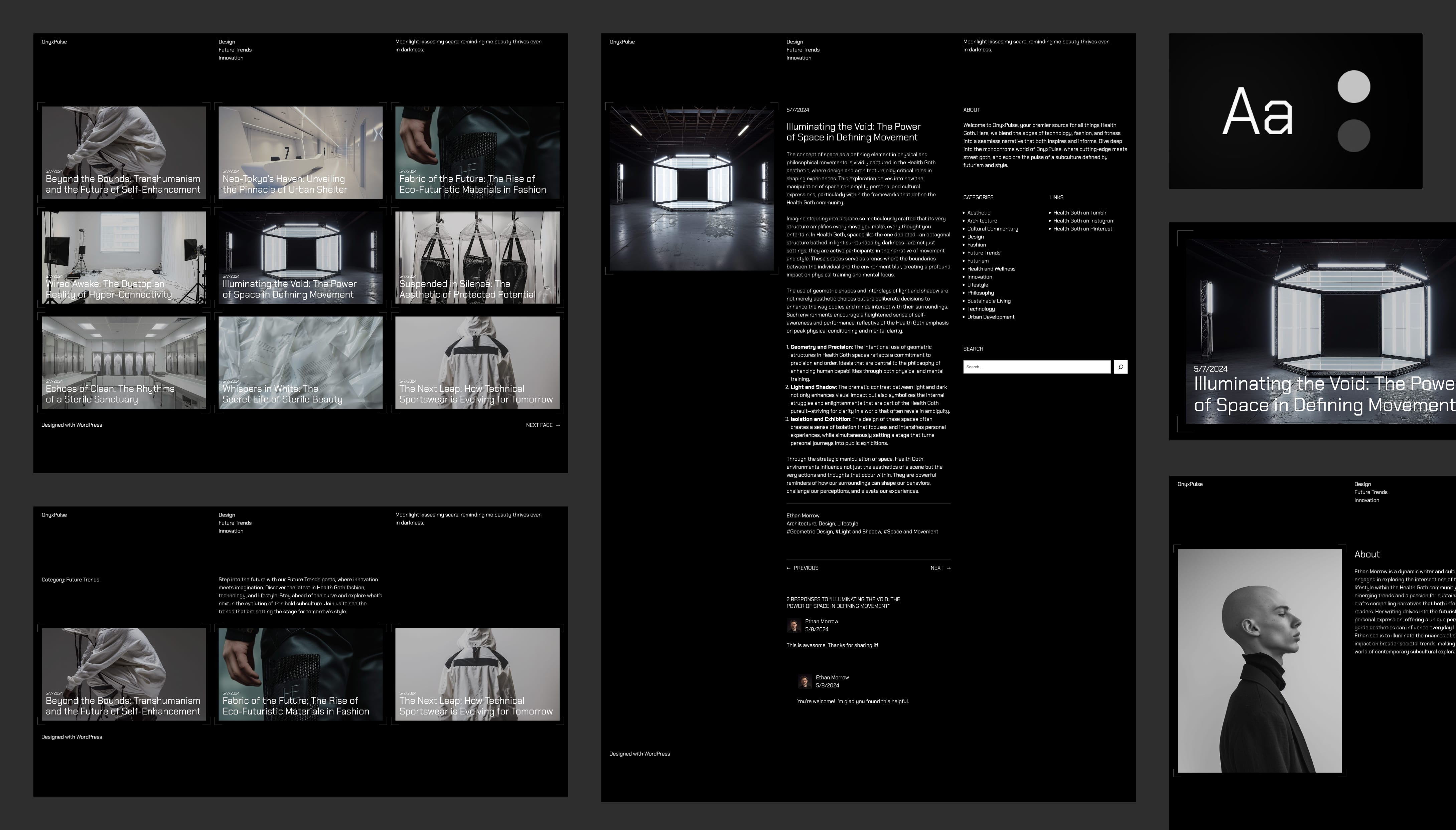 OnyxPulse is a blog theme tailored for fans of the Health Goth aesthetic. Its striking black-and-white colour palette and futuristic design elements are sure to catch their eye. For the typography, I’ve opted for Chakra Petch, a square sans-serif font. Its sharply tapered corners are a perfect match for this theme.