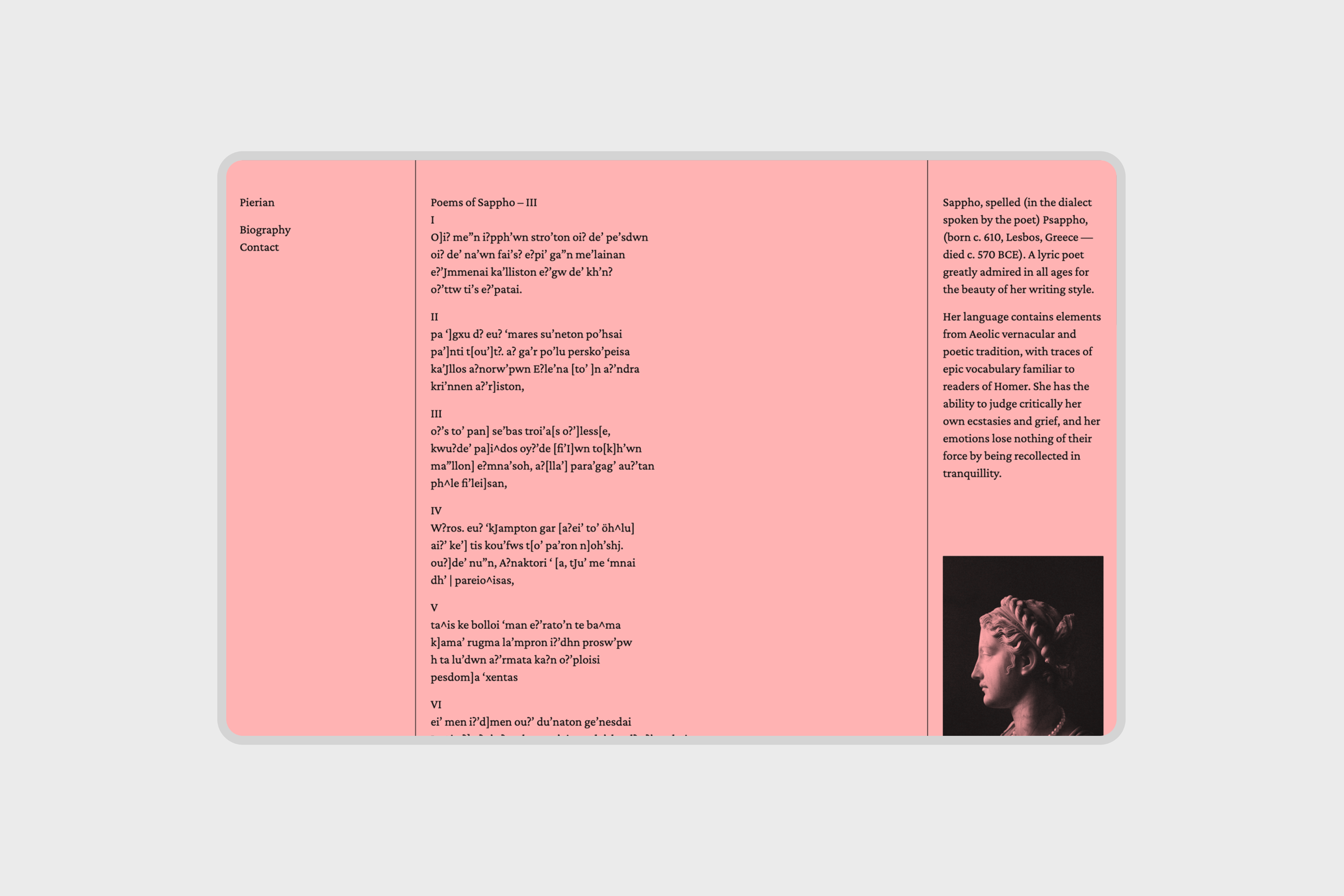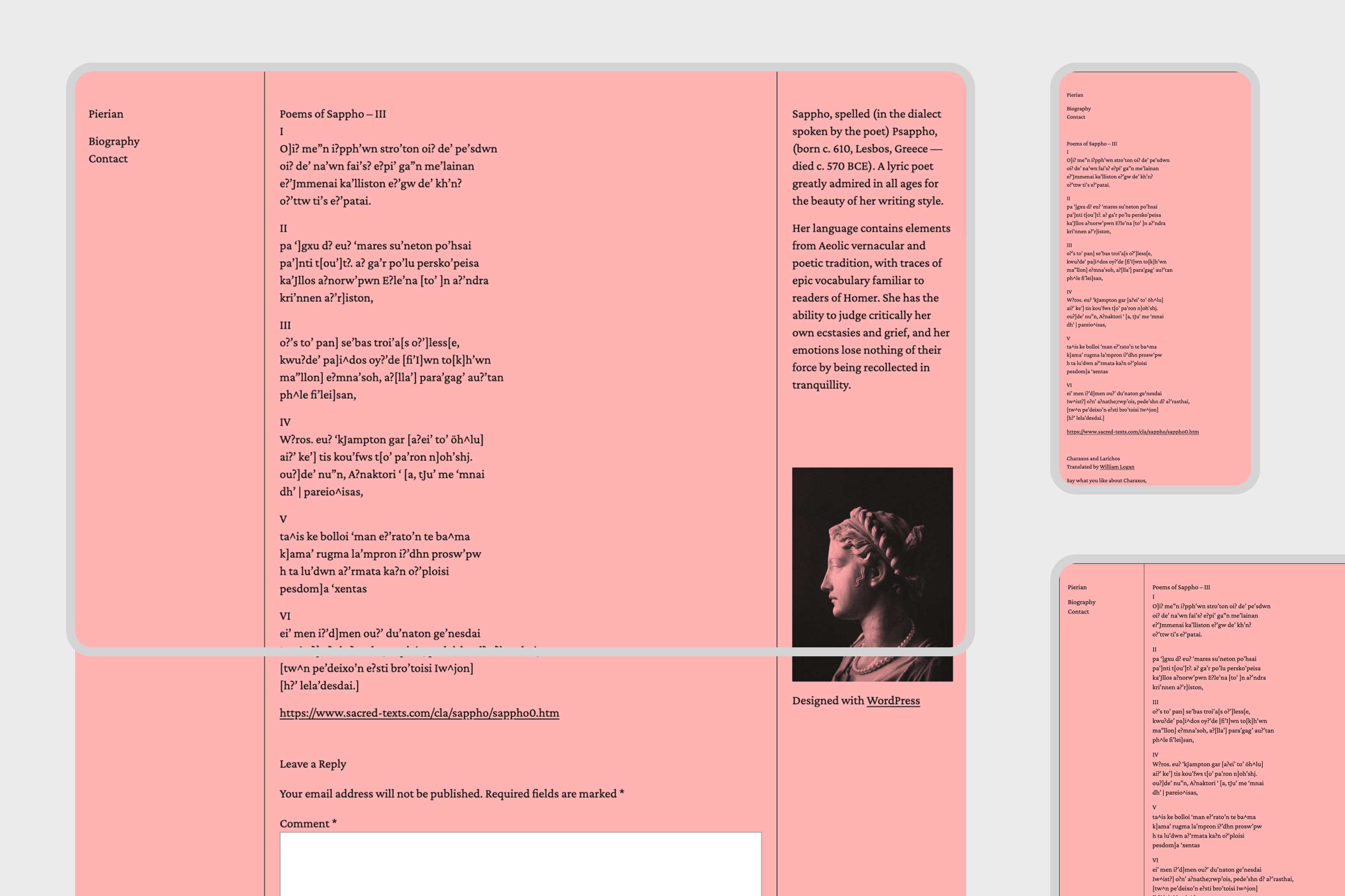 Pierian is a minimalist typography-focused theme that embraces a low-key styling approach. With equivalent headings, paragraphs, links, and navigation, it features columns that elegantly divide navigation, blog posts, and a profile block.