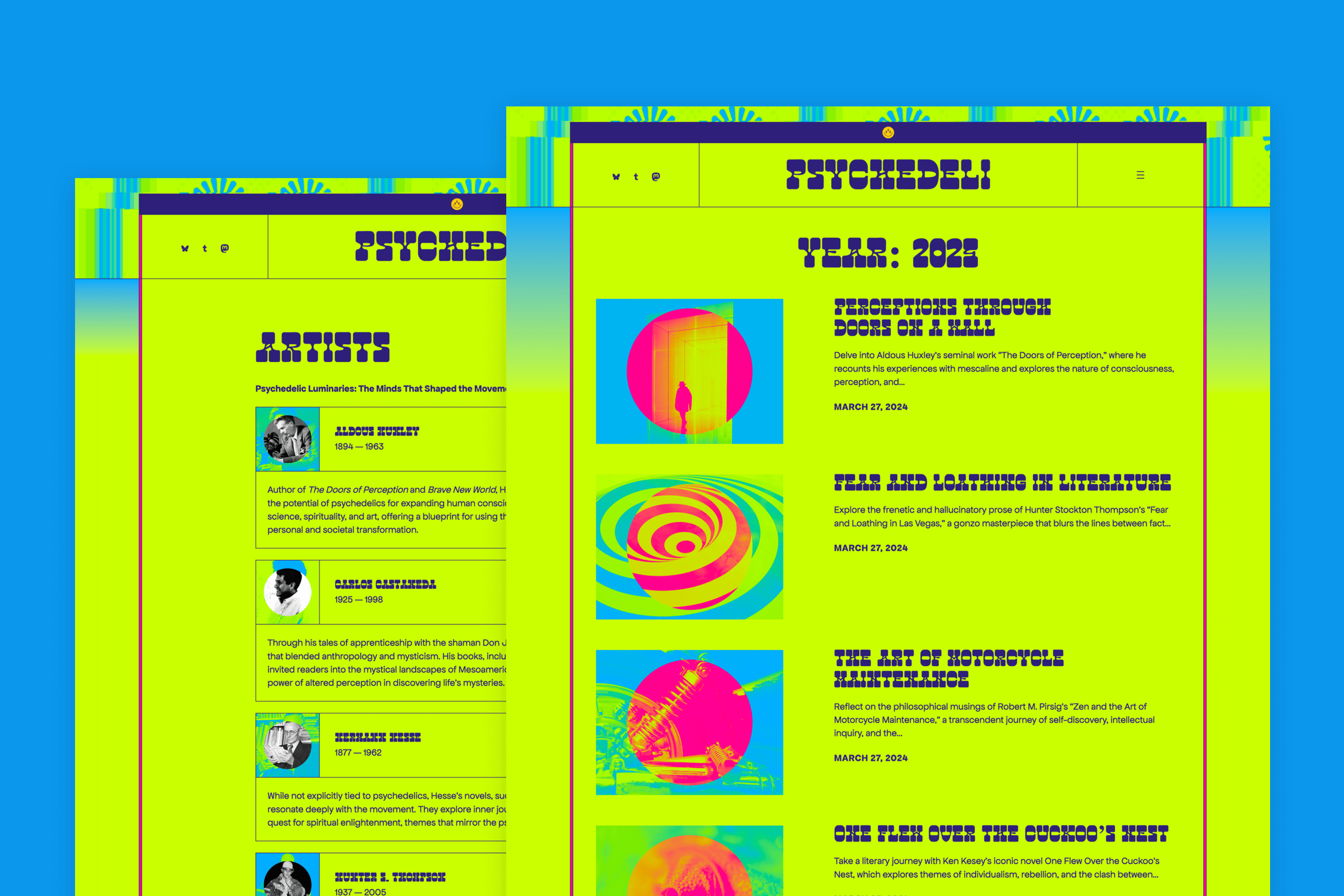Psychedeli is the ultimate WordPress theme for bloggers and artists seeking to showcase their vibrant journeys through the captivating visuals of the ’60s. Designed with passion and creativity in mind, Psychedeli is your gateway to effortlessly share your psychedelic adventures and thought-provoking creations with the world. Get ready to ignite imaginations and captivate audiences like never before with Psychedeli.