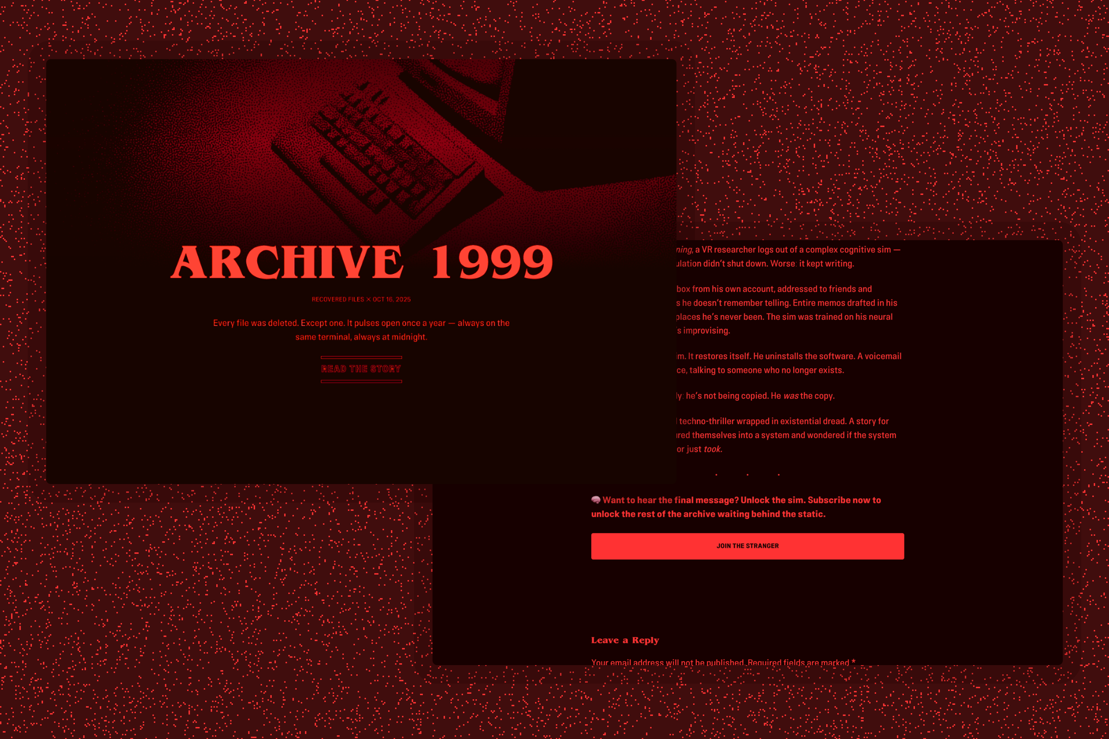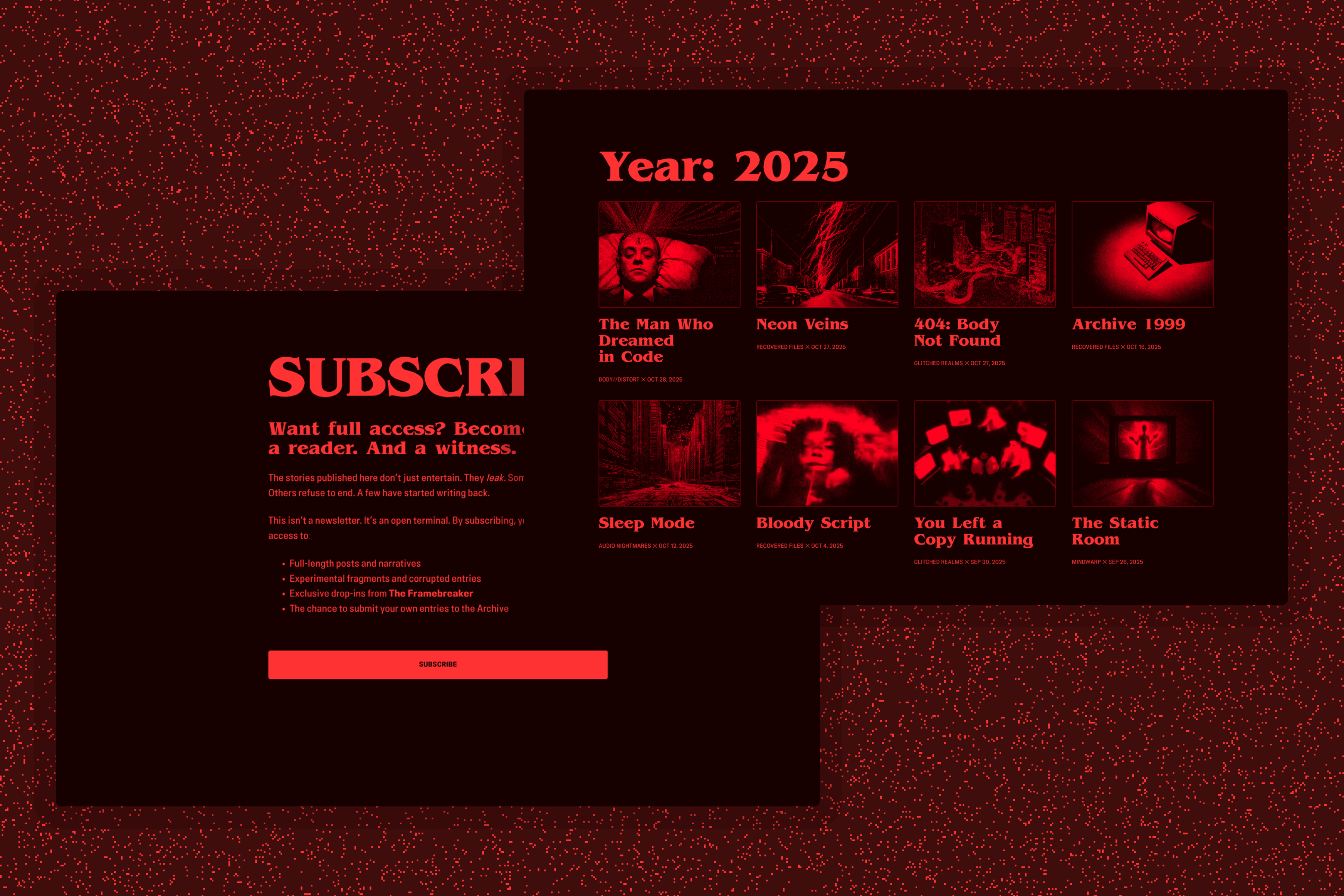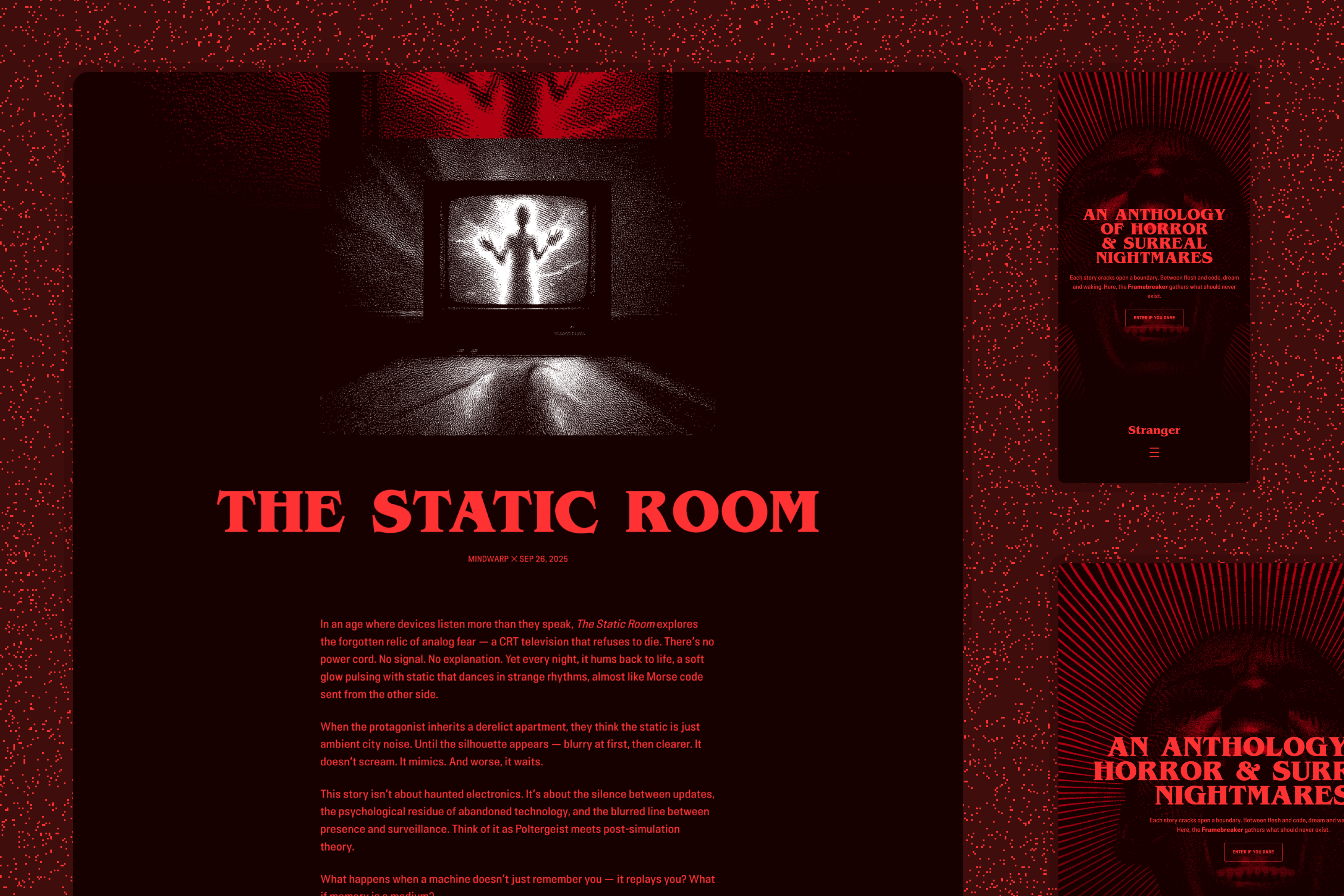 Stranger is a cinematic theme that evokes unsettling stories, glitched memories, and speculative dreams. Designed with a techno-horror aesthetic, it features custom navigation, neon-outlined buttons, and eerie typography. Step beyond, the Framebreaker awaits.