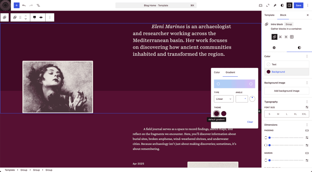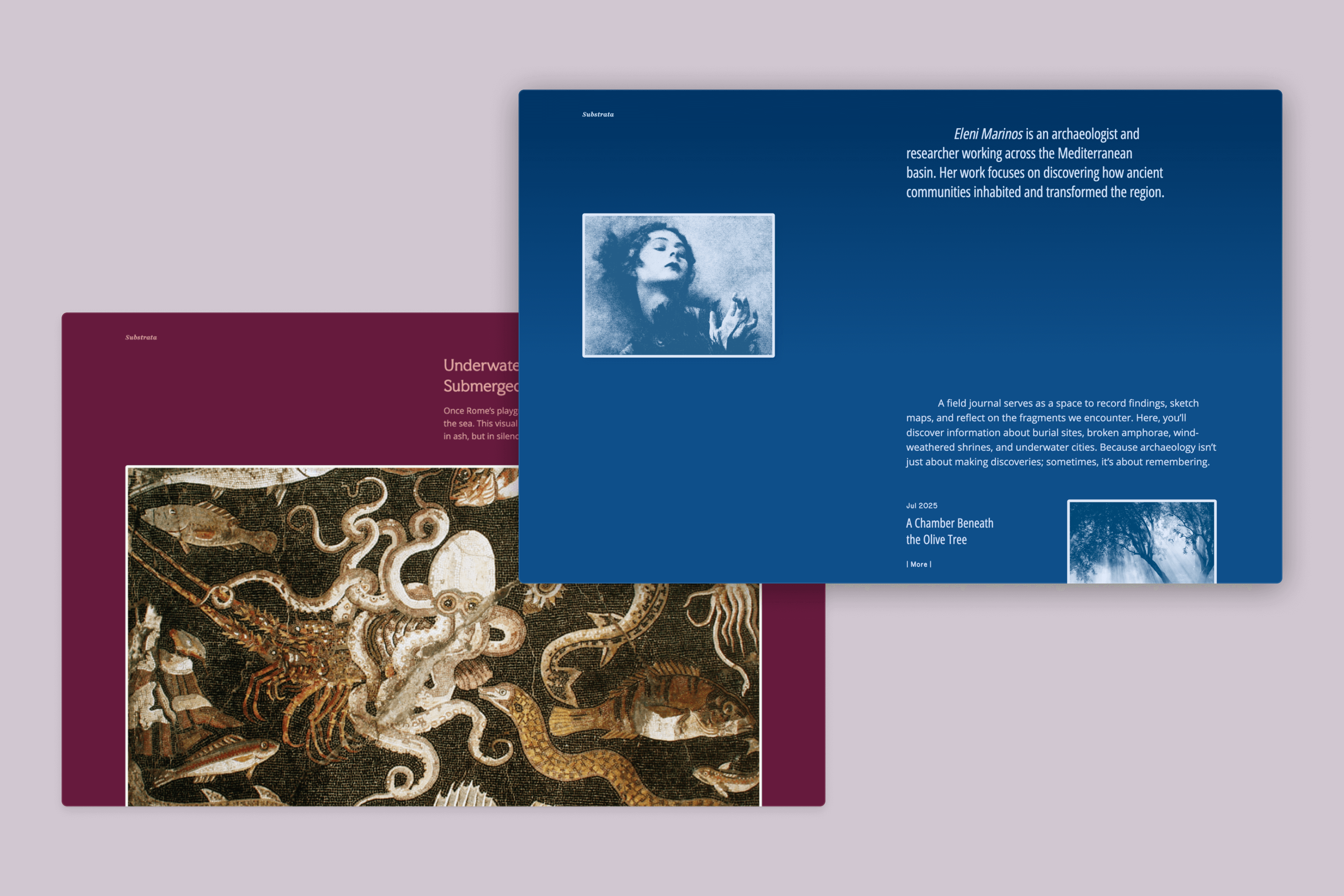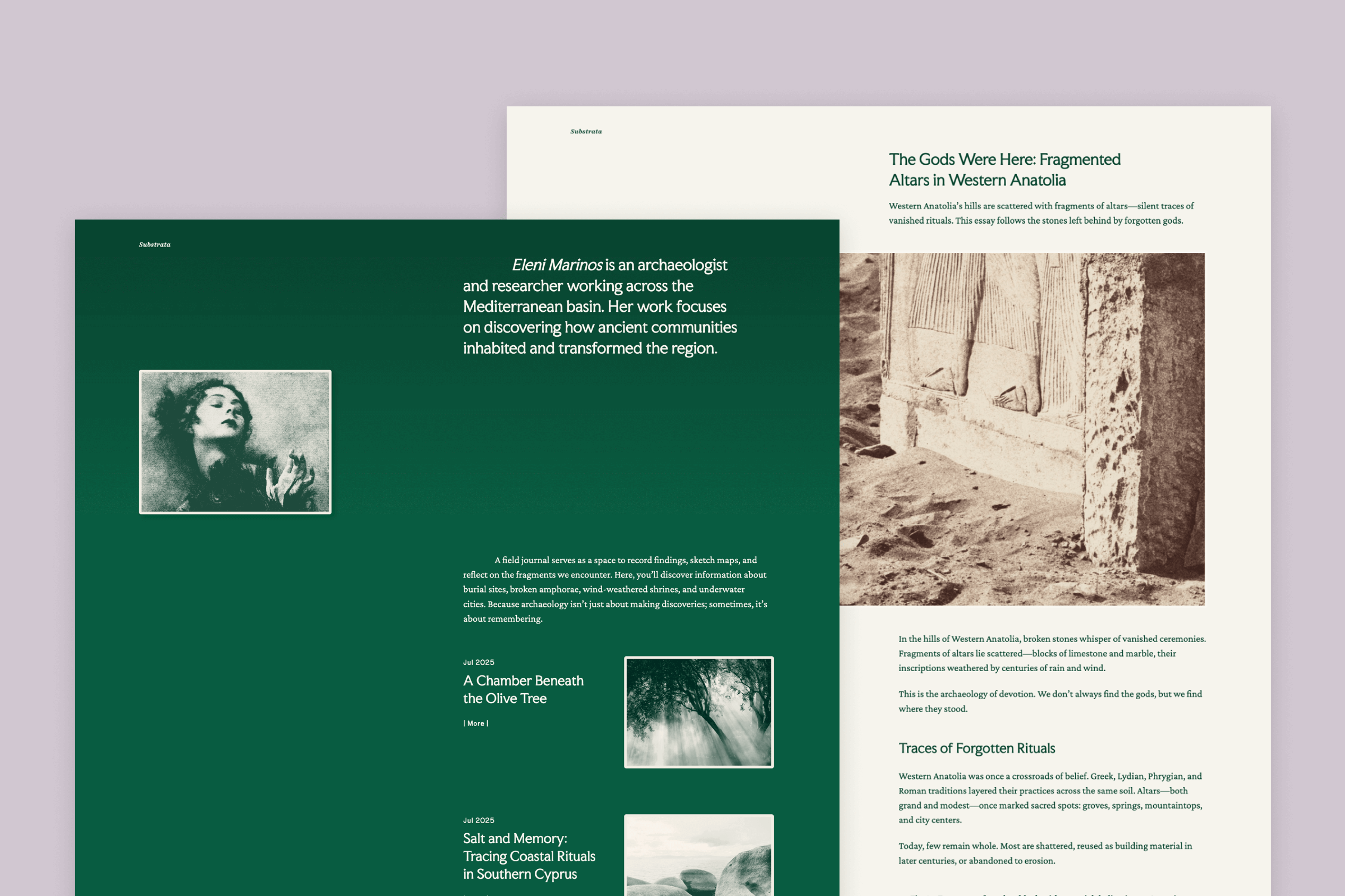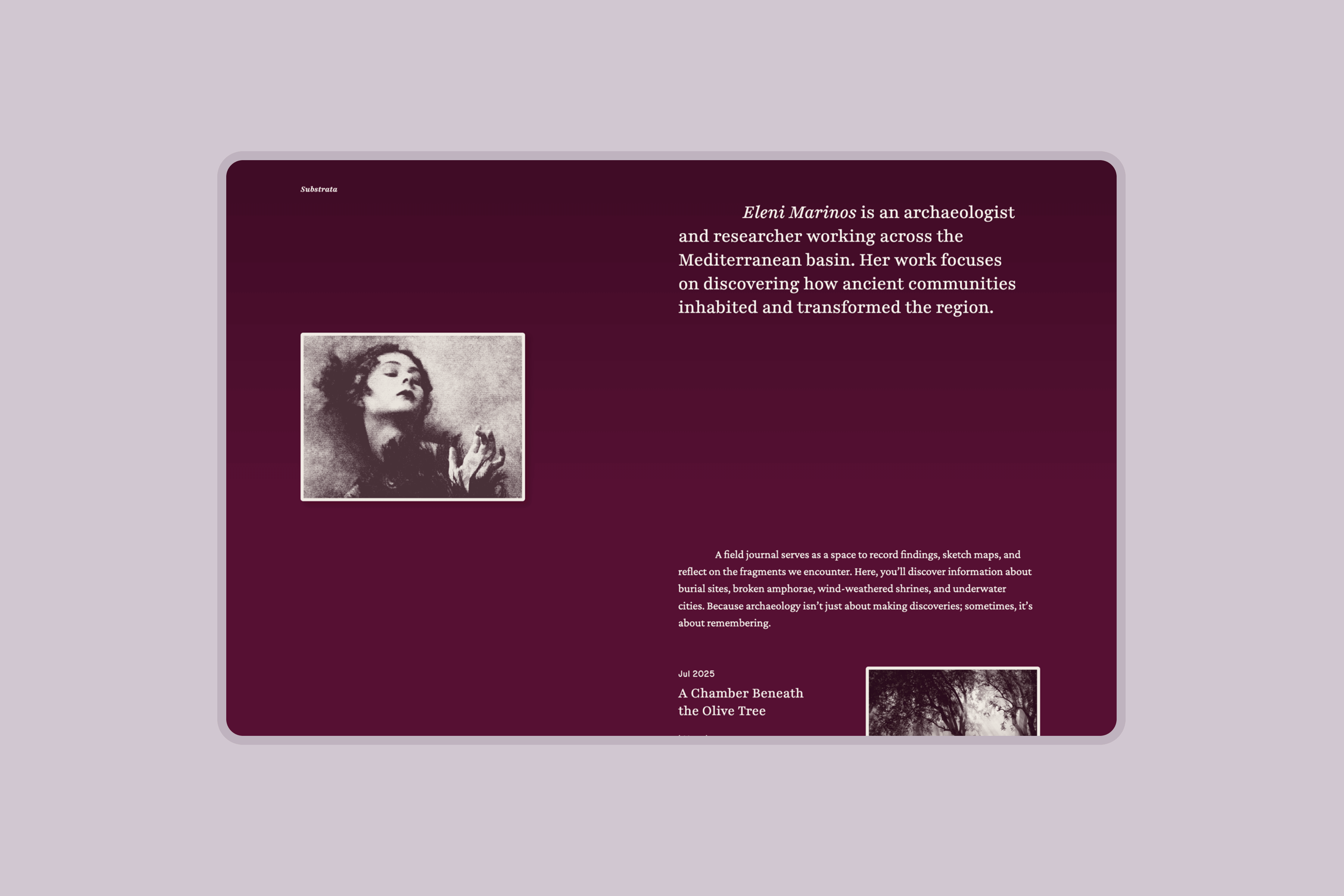 Substrata is a streamlined theme designed for historians and writers working with memory and research. Its simple layout, combined with a wide variety of style options, provides a space for reflective essays and layered narratives to document discoveries.