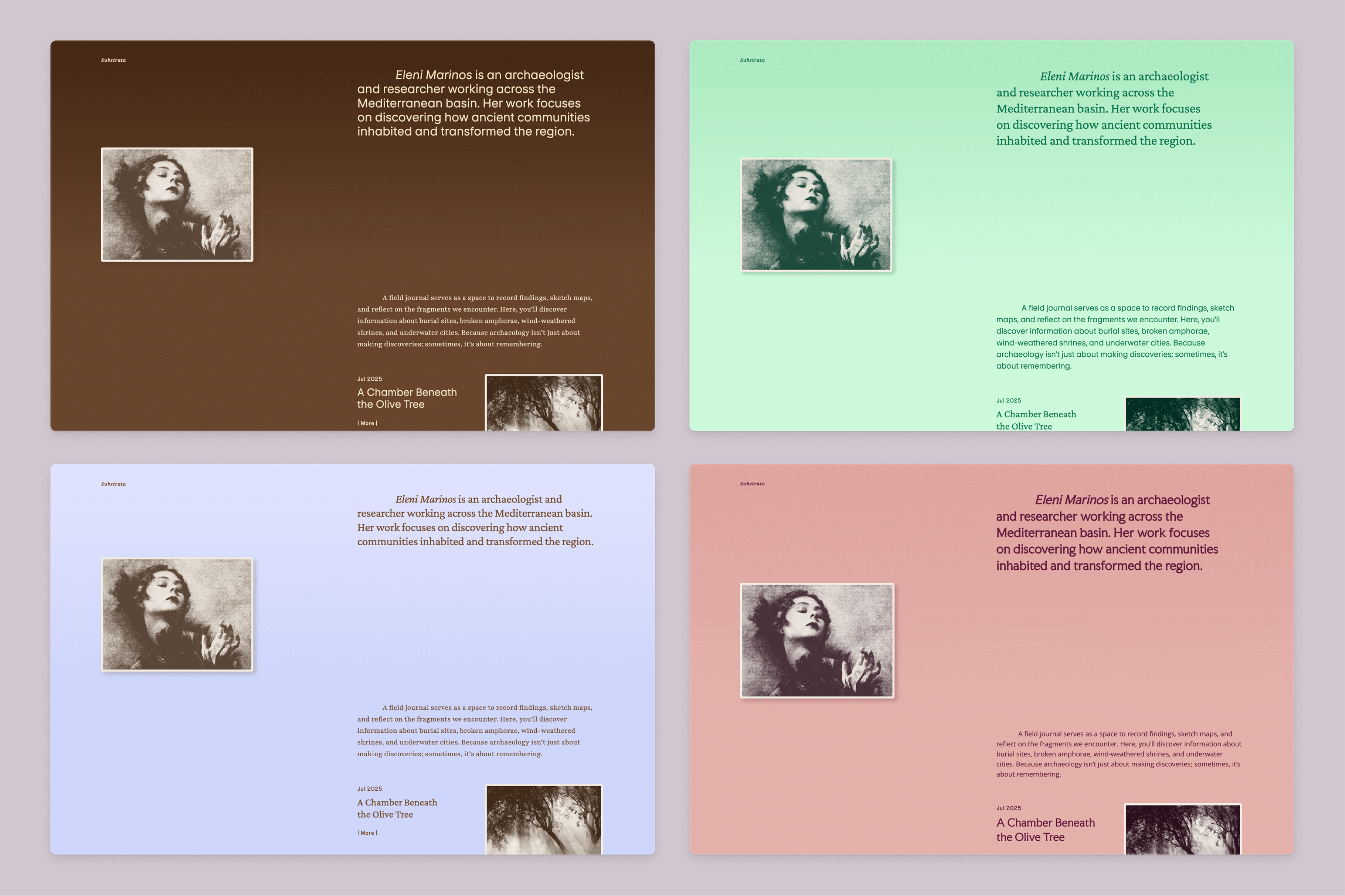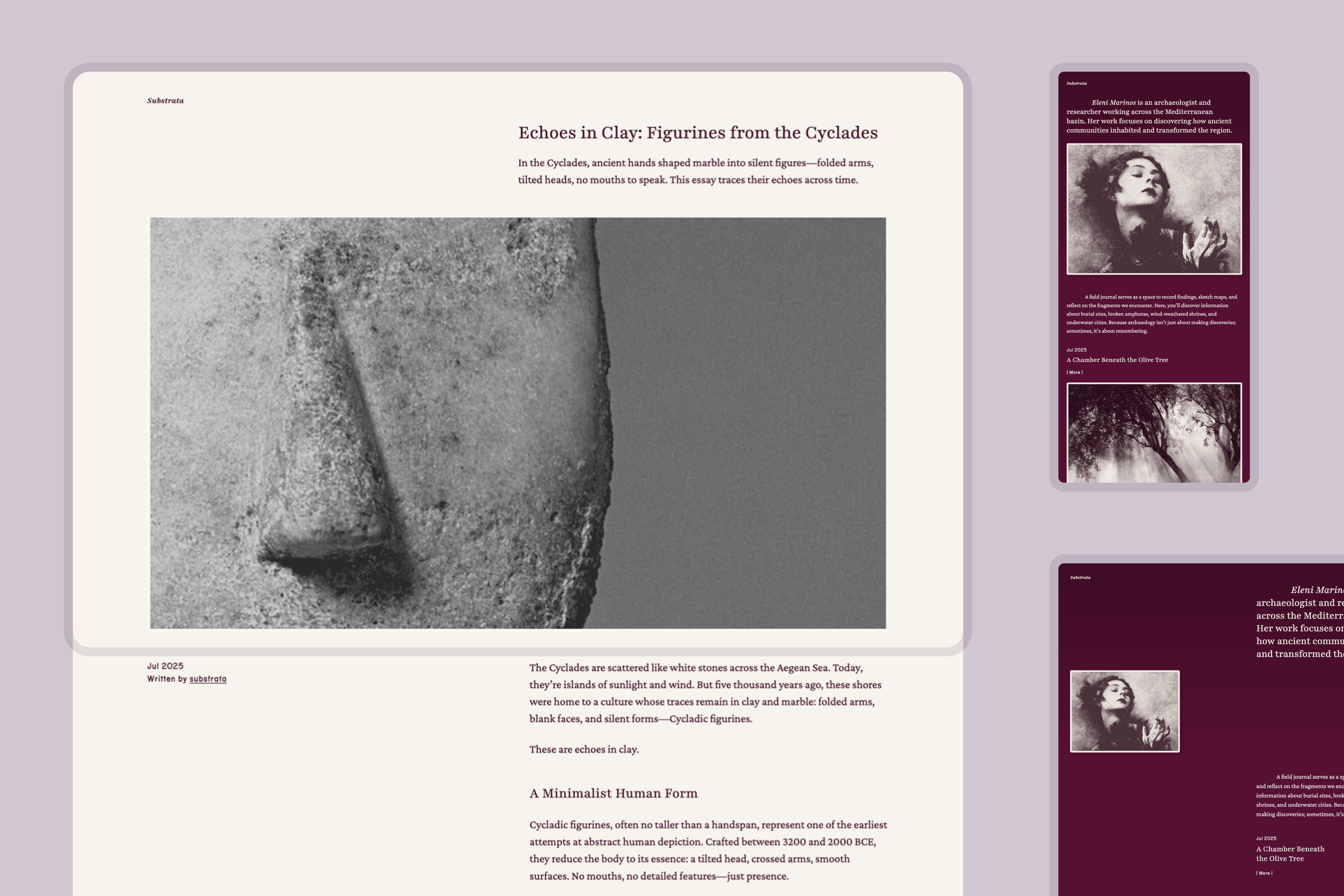 A theme for layered storytelling: Substrata’s homepage begins with a personal introduction section, setting the overall tone for the site. Its content layout promotes free writing and avoids strict categorization. Each template allows for immersive reading with ample spacing and a clear typographic hierarchy.