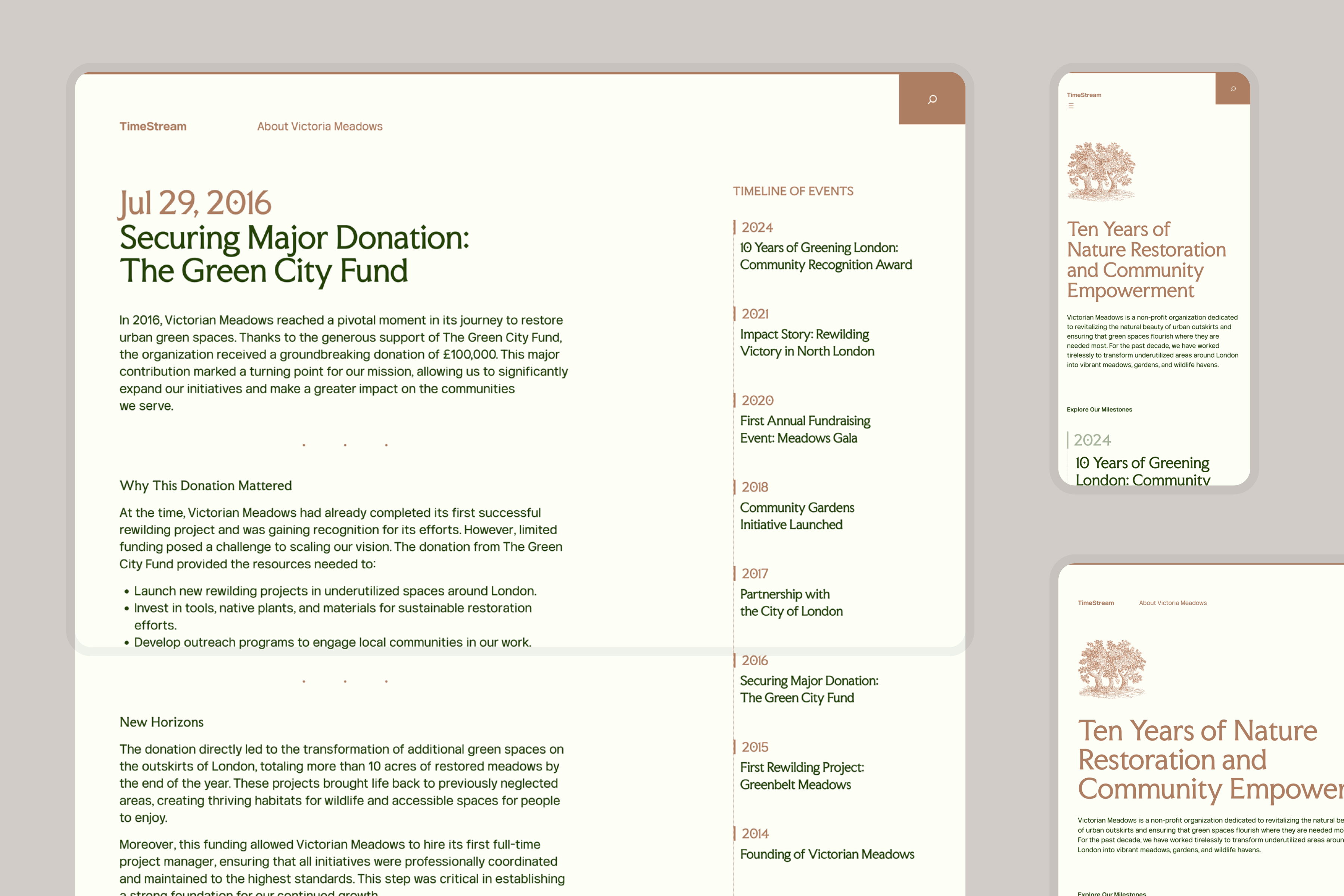 To compose the visuals of a timeline, I invested into a three columns block wrapped by a 1px border. The border was by the left. It was attached to the date element. As the use of images is optional in such presentations, I left it hang on a third column.
