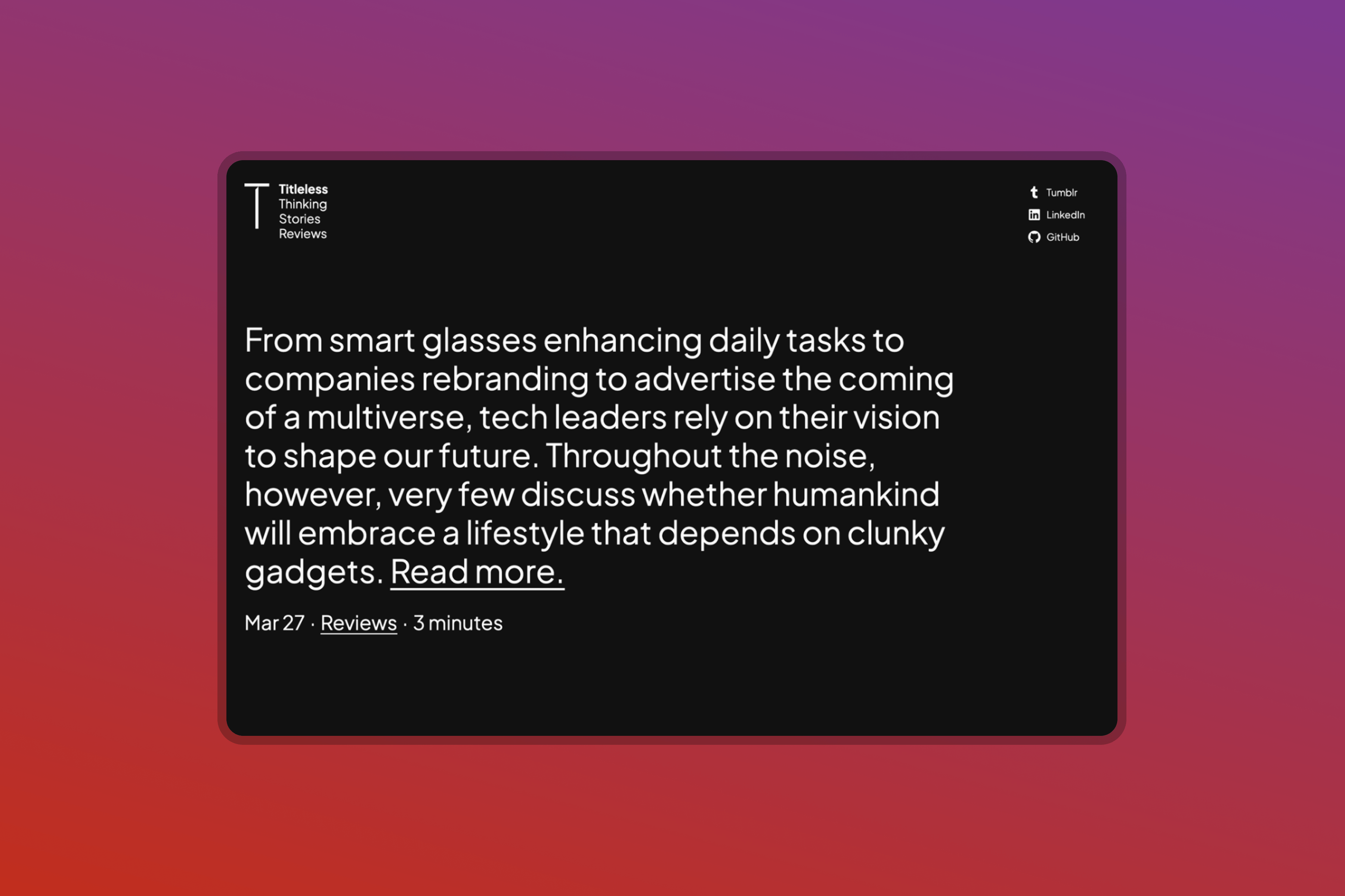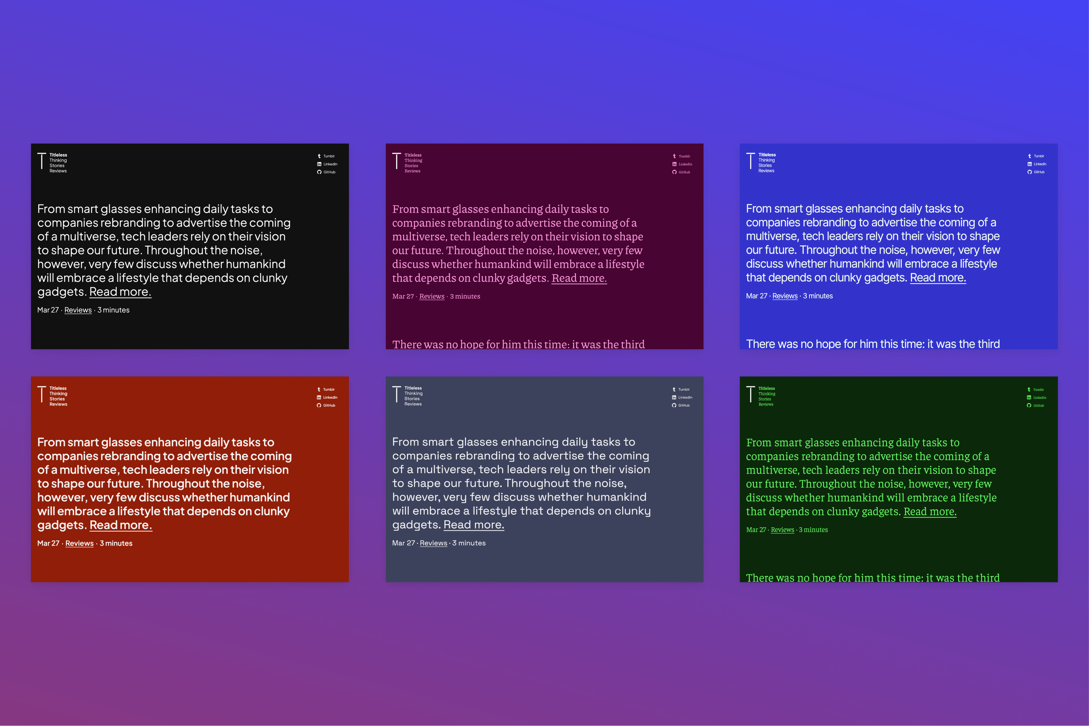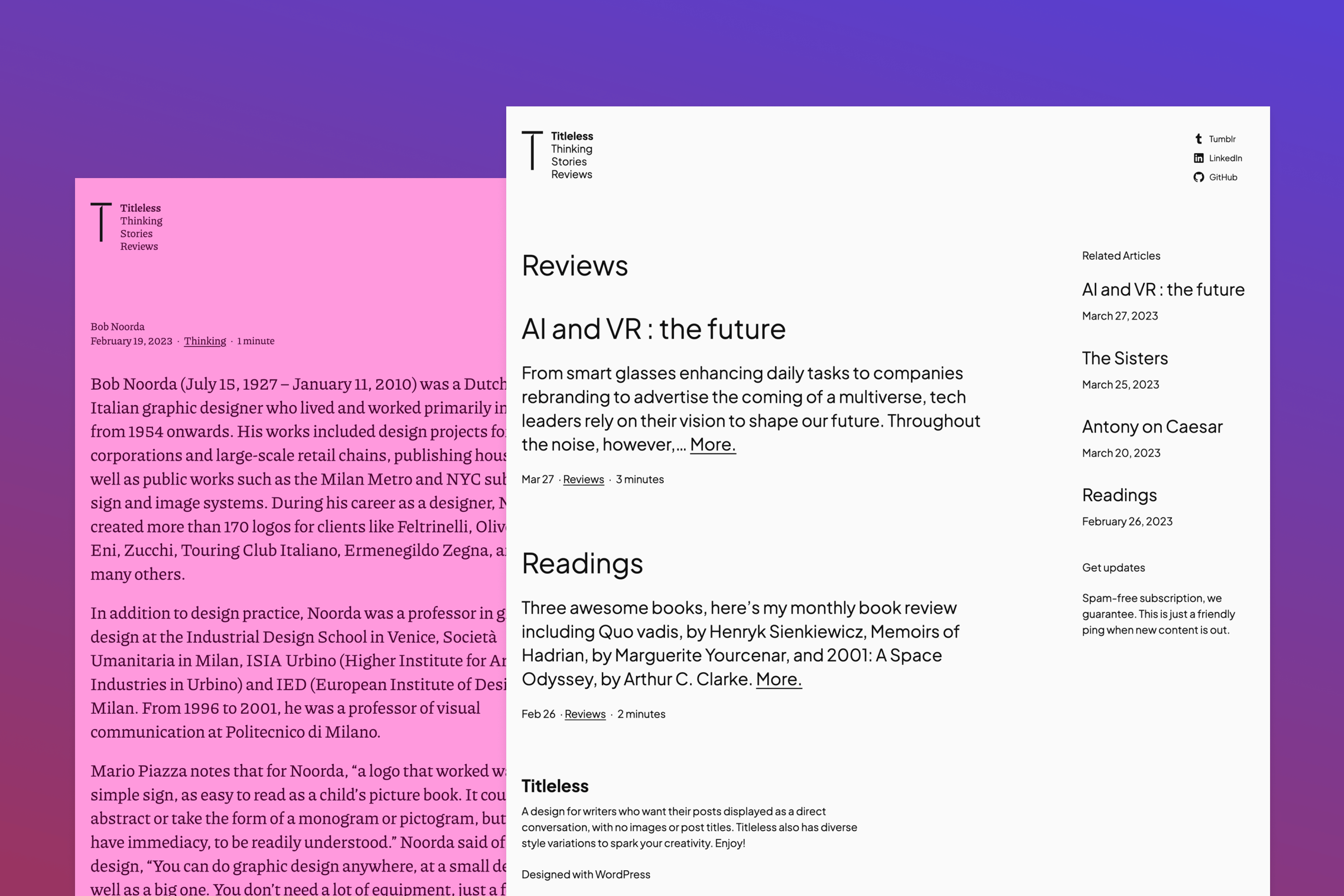Titleless is a text-only blog theme that trusts post excerpts rather than titles and featured images and has many variations.