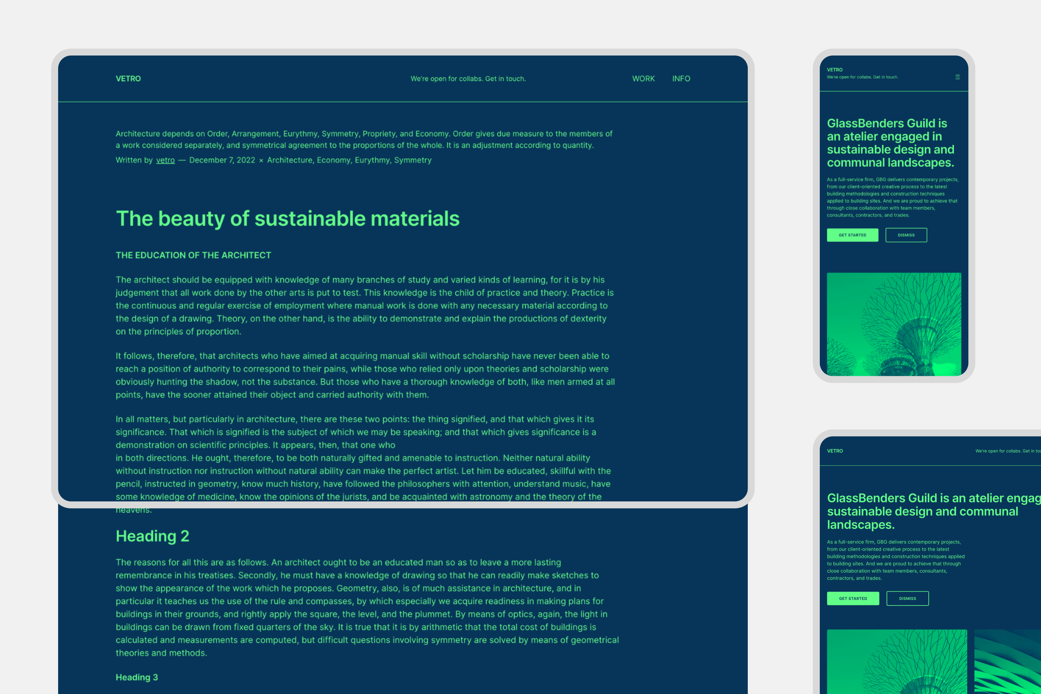 Vitrum was designed as a portfolio theme and is composed of wide layouts with the impact of generous imagery and typography. Its simple pages are aligned left with fair right paddings and large content blocks to grant viewers focus on visuals and short paragraphs.